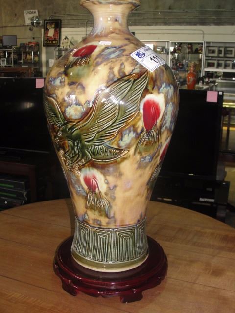 CHINESE PAINTED VASE WITH EAGLE FIGURE ON IT AND ROSEWOOD STAND