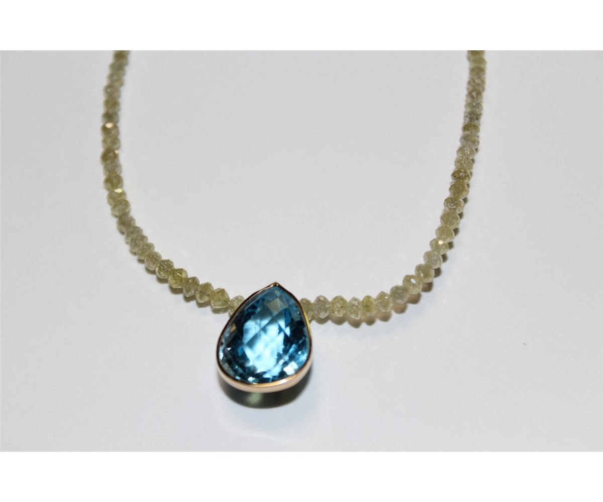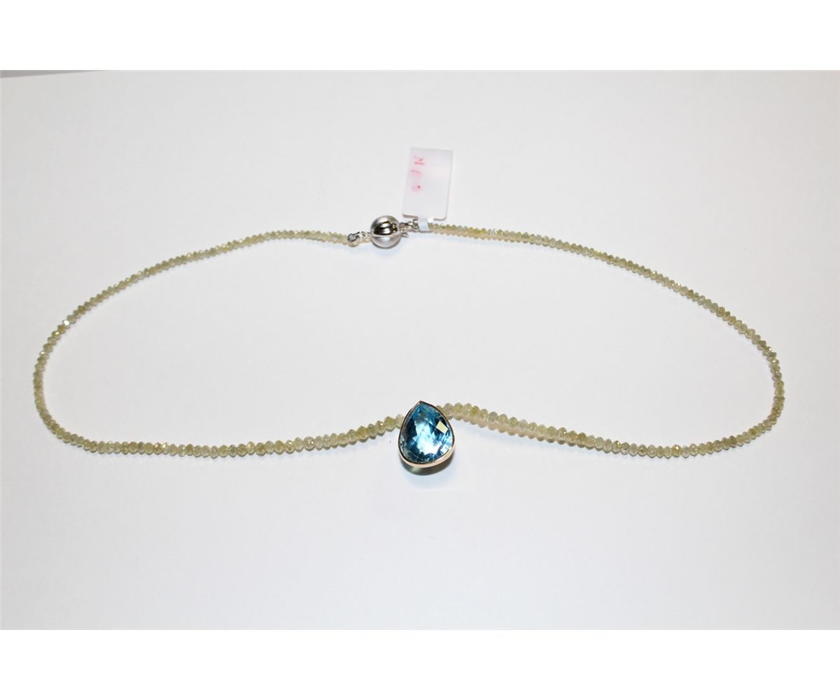 CHOKER LENGTH FACETED DIAMOND BEAD NECKLACE WITH A NATURAL BLUE TOPAZ PENDANT. 39CM STAND OF ROUND FACETED DIAMOND BEADS APPROX. 22.70 CARATS & 14 KT. YELLOW GOLD PEAR SHAPED BEZEL SET CHECKERBOARD CUT NATURAL BLUE TOPEZ. REPLACEMENT VALUE: $2850