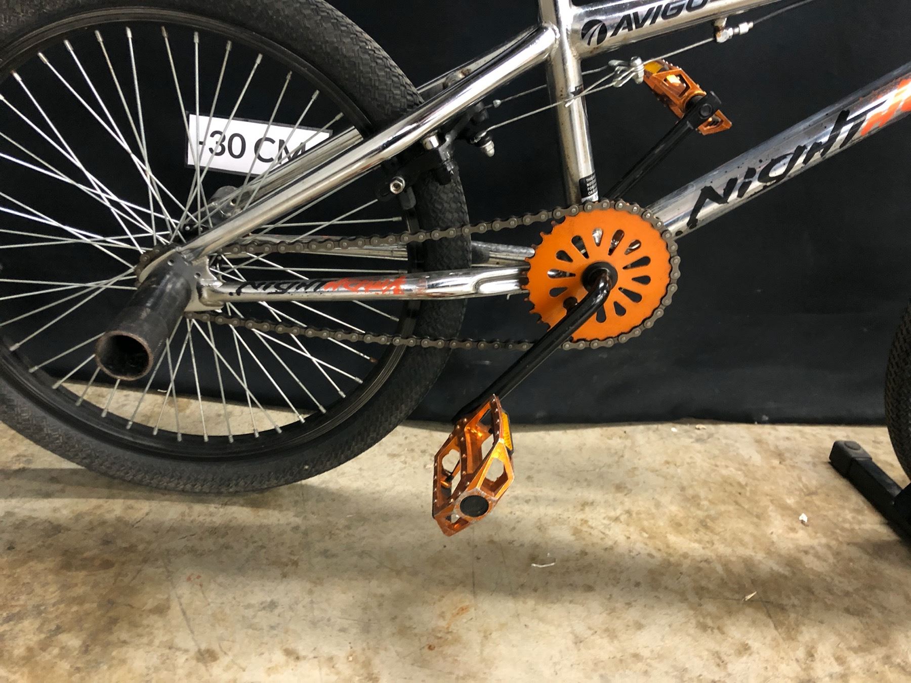 CHROME AND ORANGE AVIGO FREESTYLE NIGHT HAWK BMX BIKE WITH FRONT AND REAR BRAKES, PEGS AND GYRO