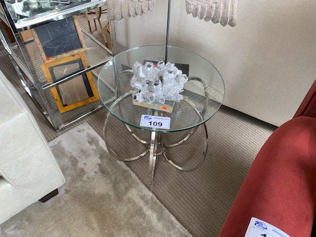 CHROME METAL & GLASS ROUND END TABLE WITH DECOR ITEMS