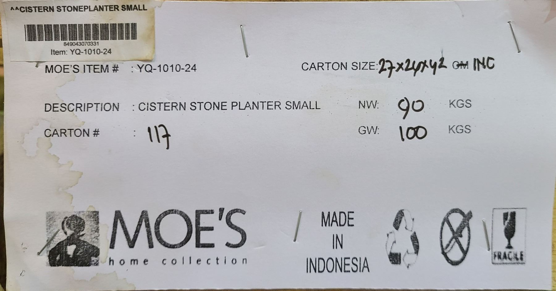 CISTERN STONE PLANTER SMALL NW 90KG GW 100KG APPROX. H 32" W 20"