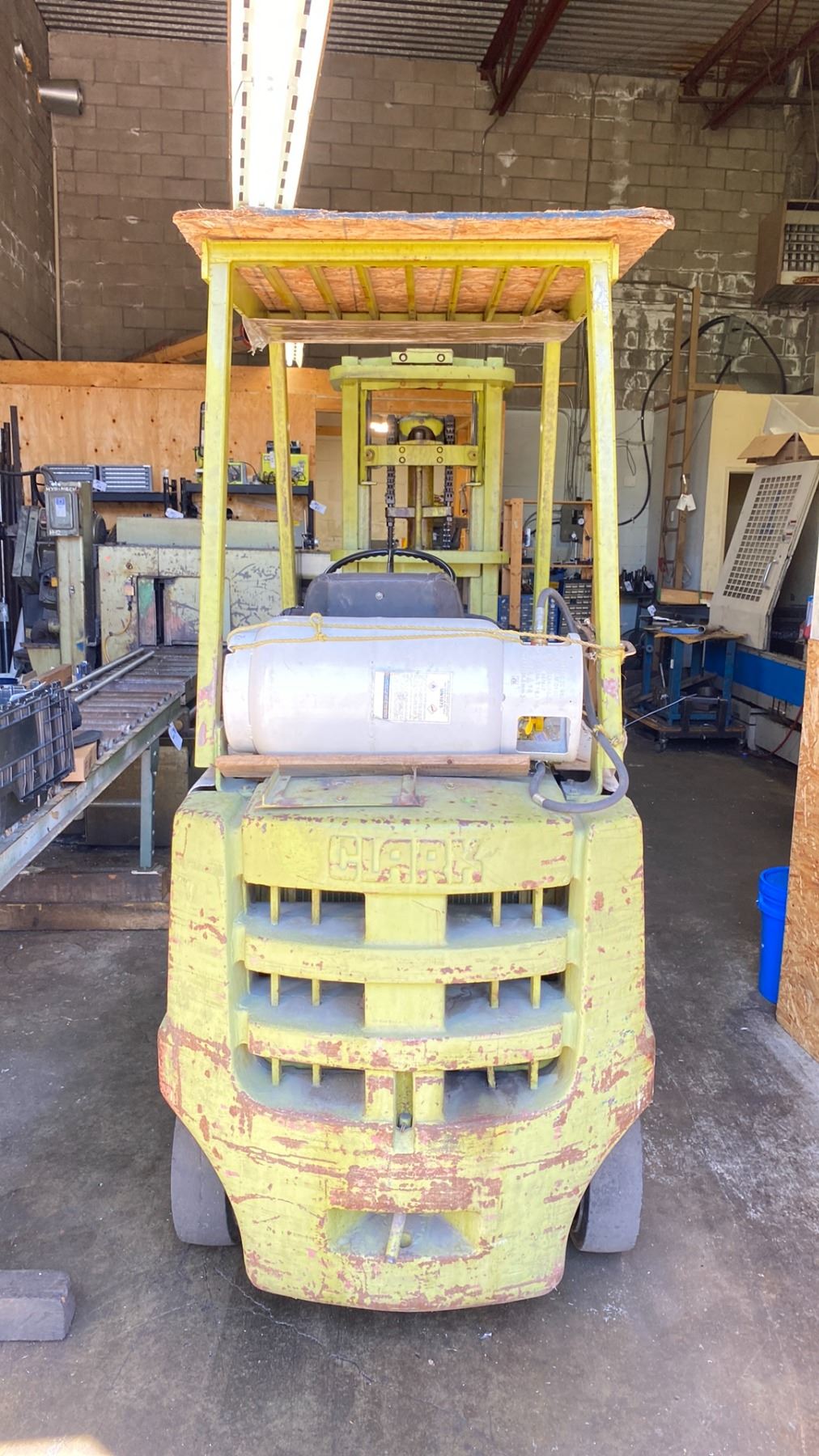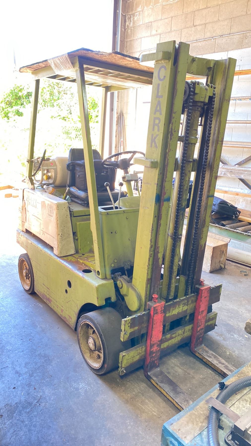 CLARK FORKLIFT - SINGLE MAST, 42" STANDARD FORKS, SOLID TIRES, COMES WITH PROPANE TANK * HARD STARTING* * NO BRAKES AT ALL UNIT IS NOT DRIVEABLE TOW ONLY