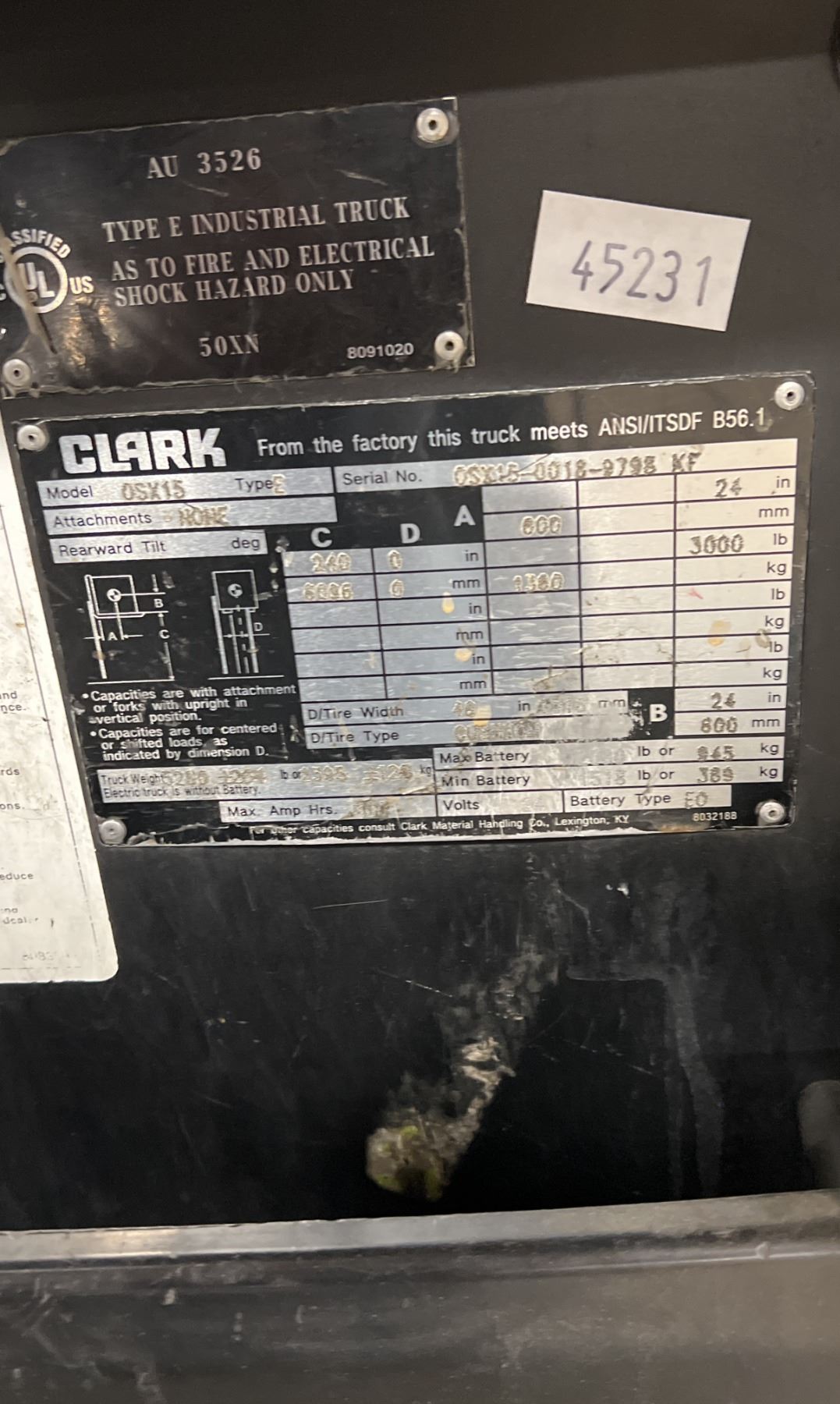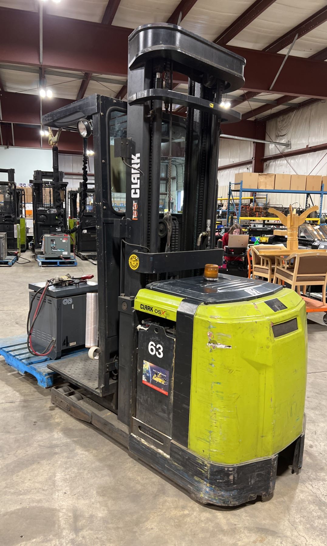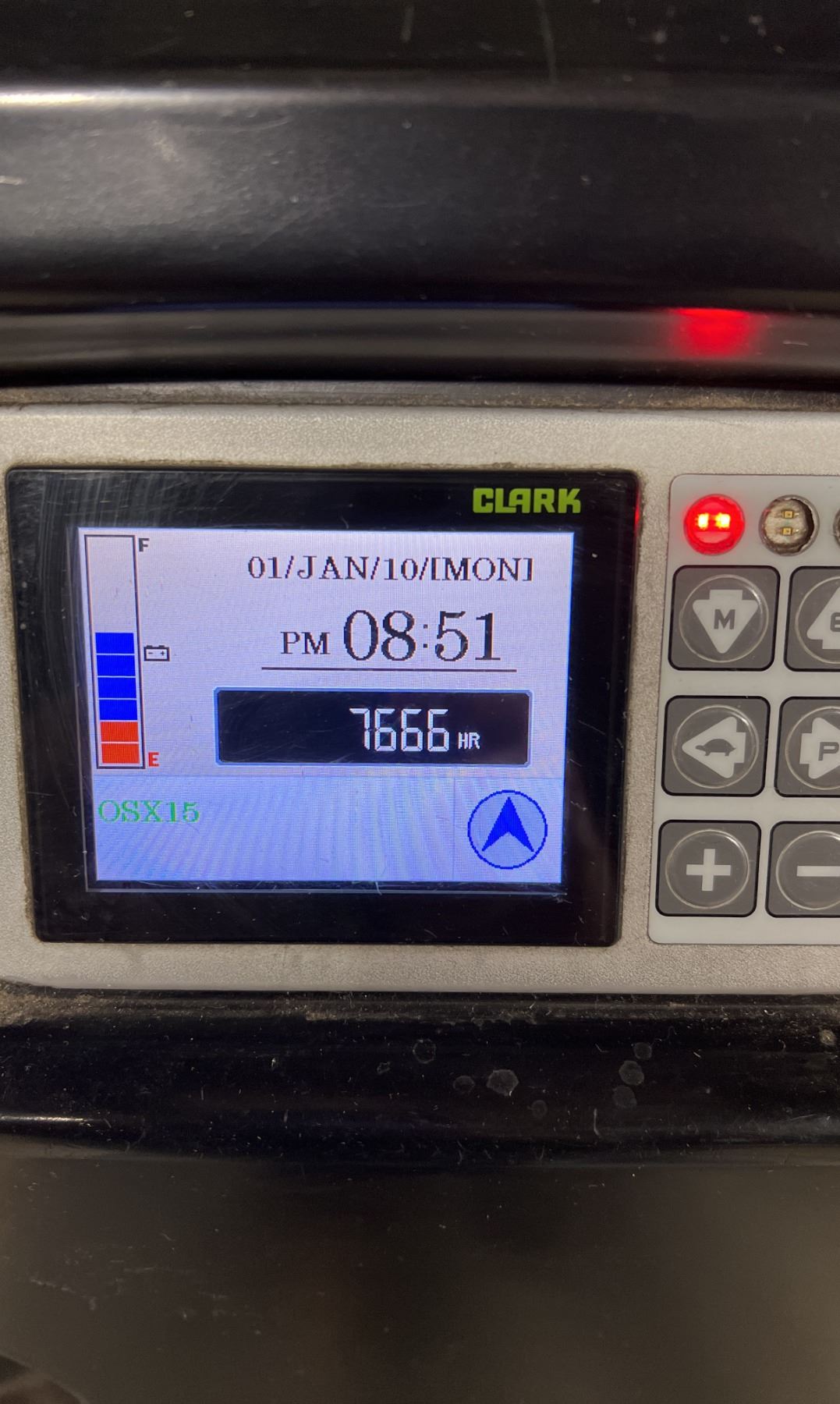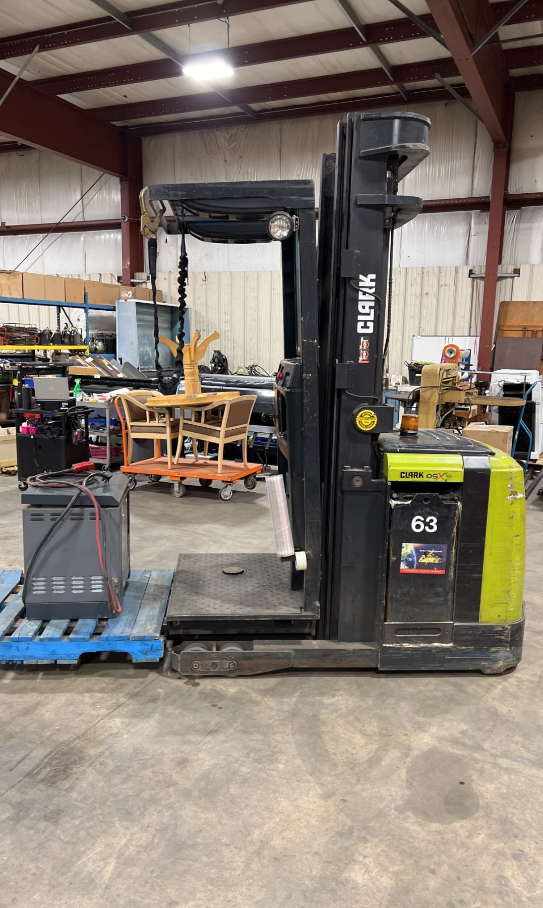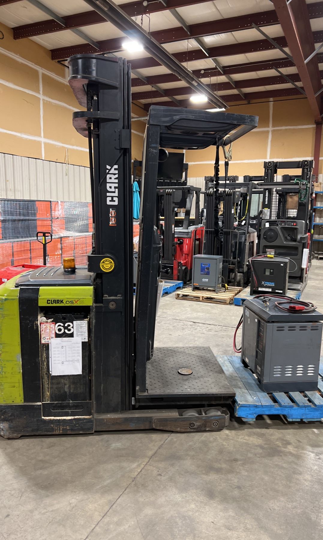 CLARK OSX15 3 STAGE 3000 LBS CAPACITY 600MM MAST HEIGHT 24V ELECTRIC STAND UP ORDER PICKER WITH EXIDE TECHNOLOGIES XPT12-1050B EX-F INDUSTRIAL 3 PHZ BATTERY CHARGER *HOUR METER READS 7666HR, HOURS NOT VERIFIED*