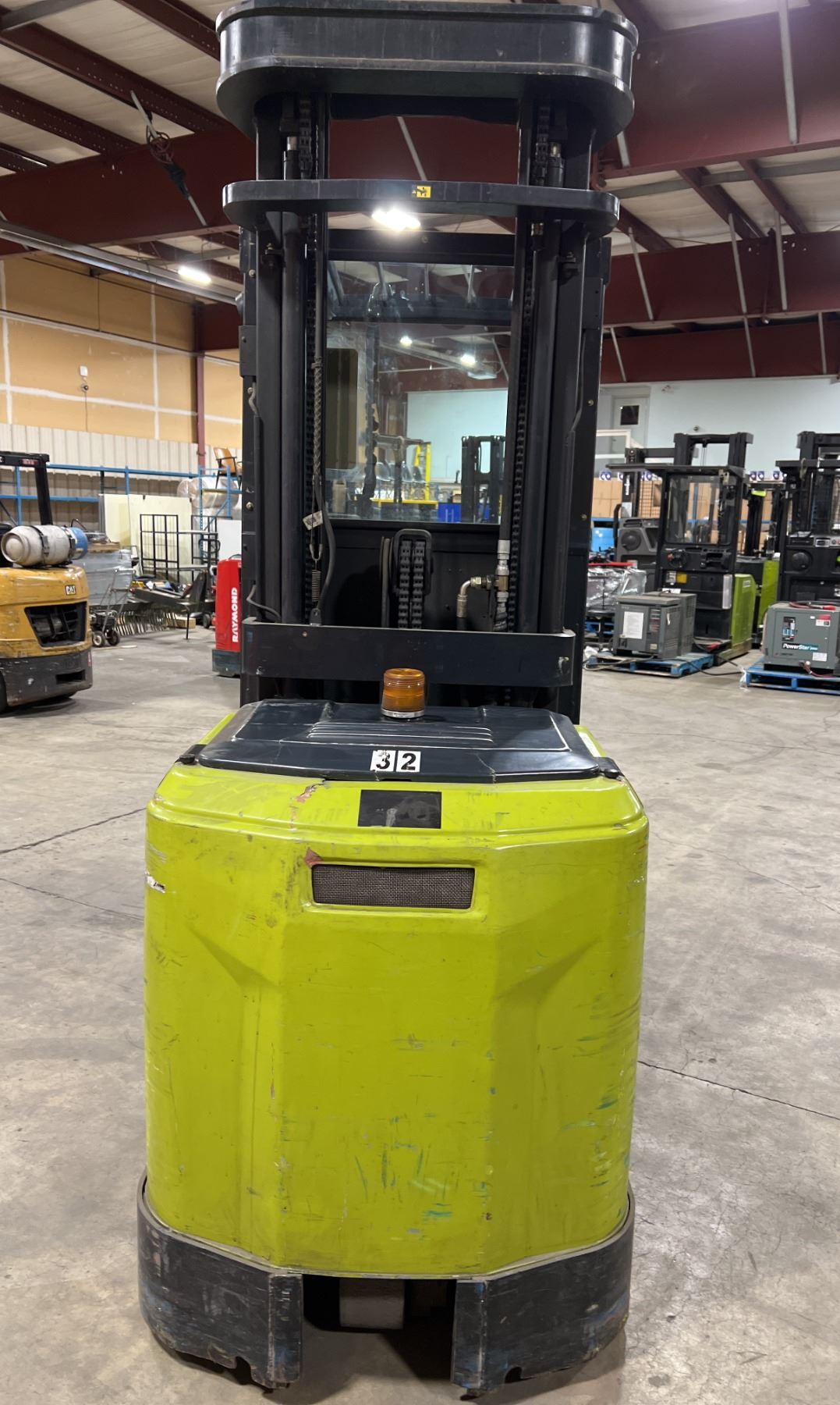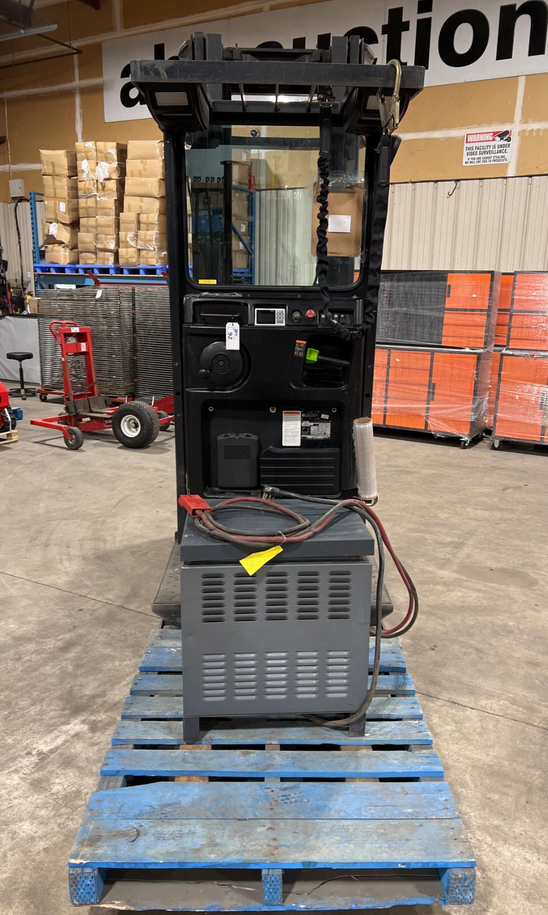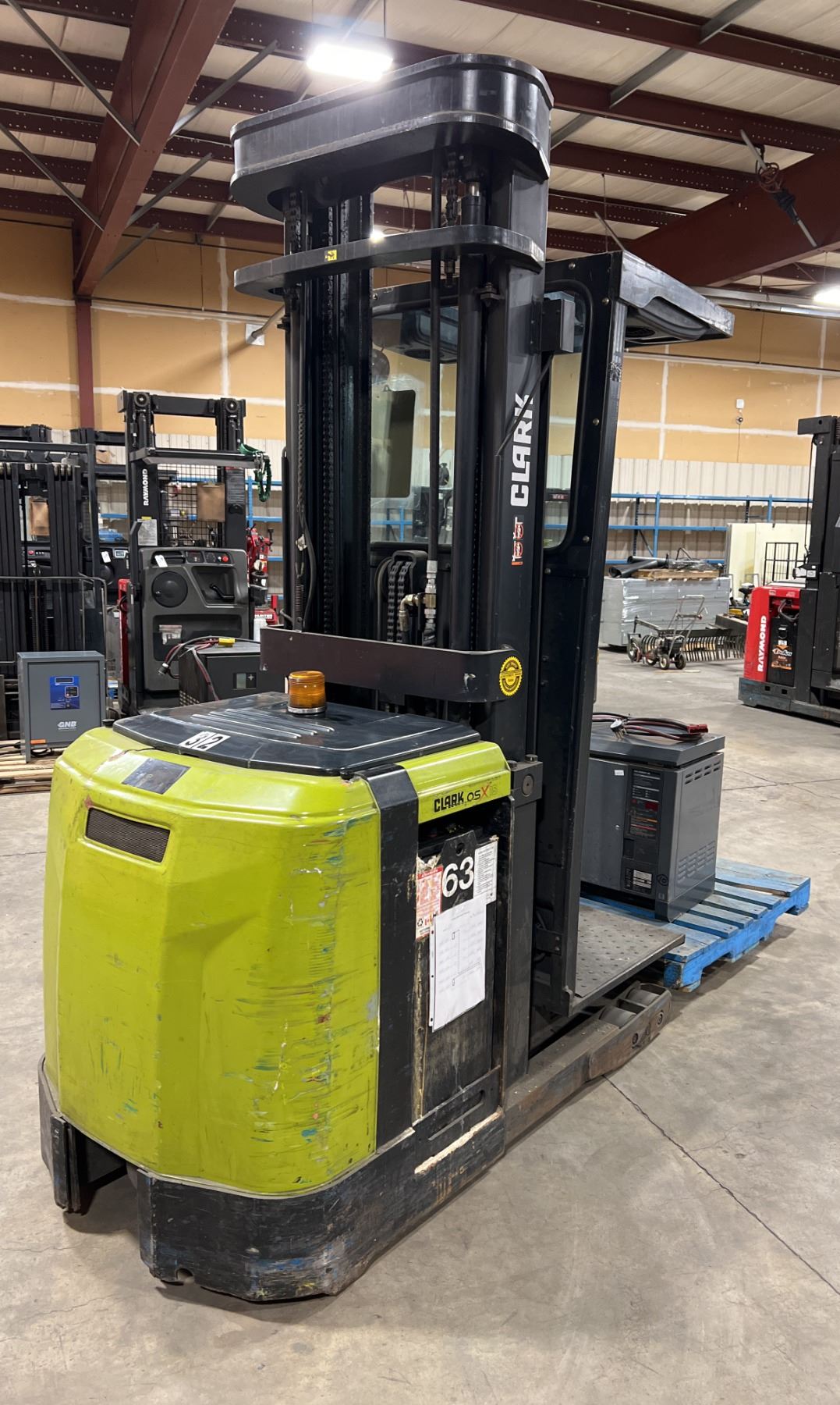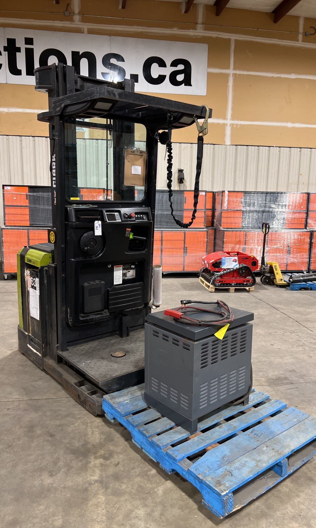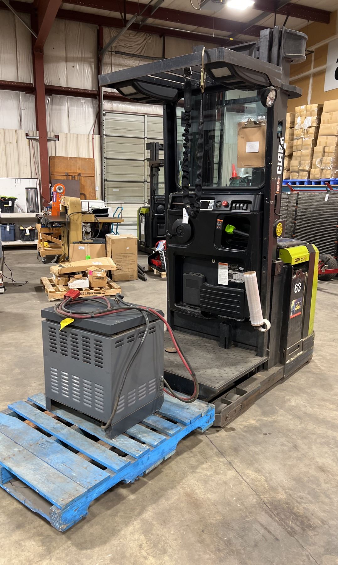 CLARK OSX15 3 STAGE 3000 LBS CAPACITY 600MM MAST HEIGHT 24V ELECTRIC STAND UP ORDER PICKER WITH EXIDE TECHNOLOGIES XPT12-1050B EX-F INDUSTRIAL 3 PHZ BATTERY CHARGER *HOUR METER READS 7666HR, HOURS NOT VERIFIED*