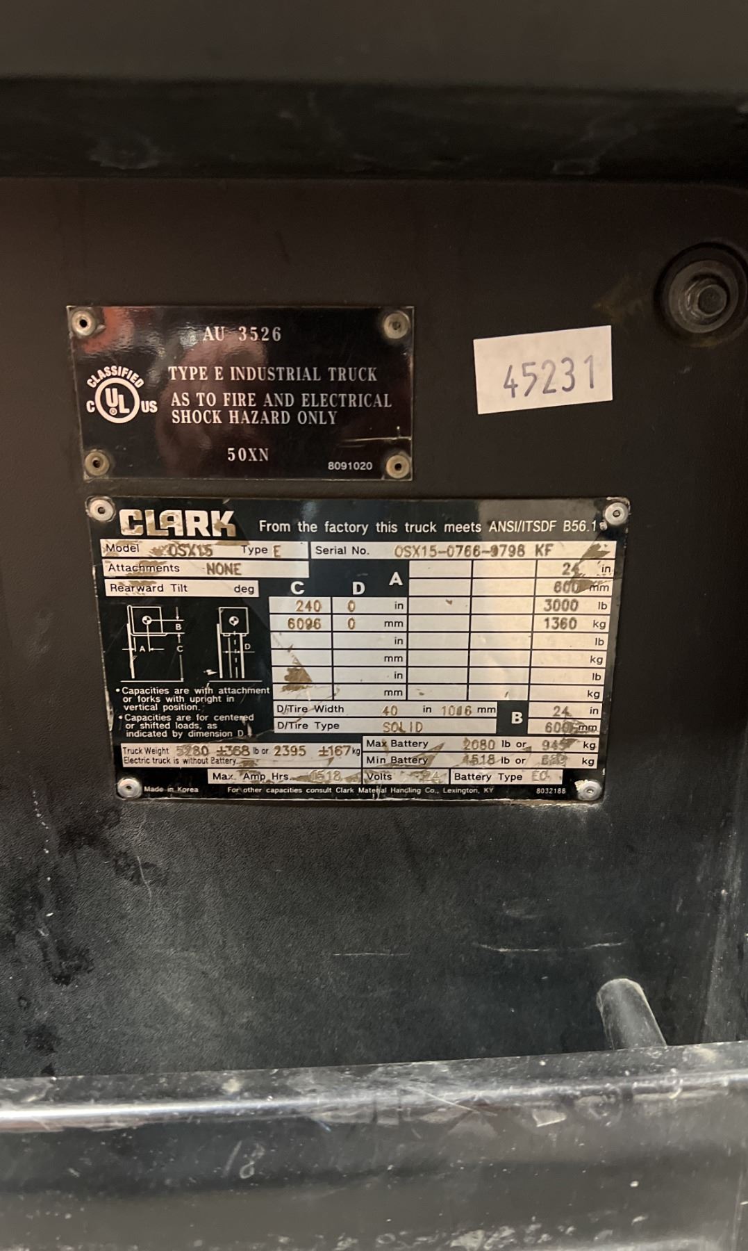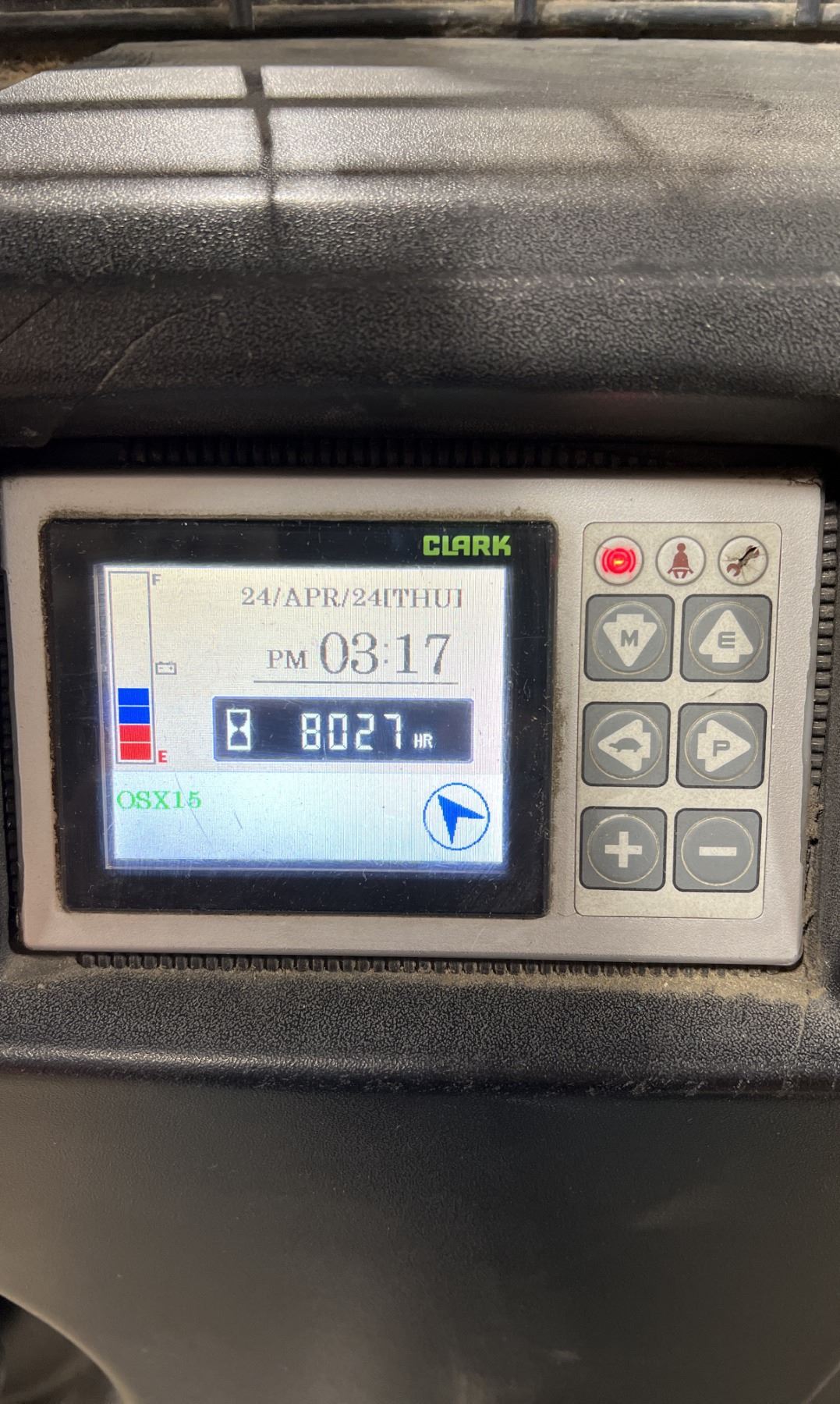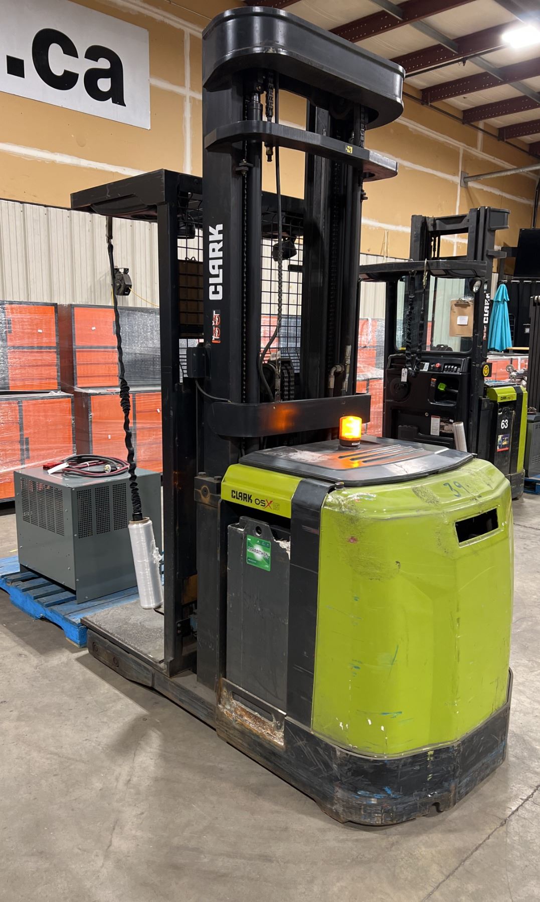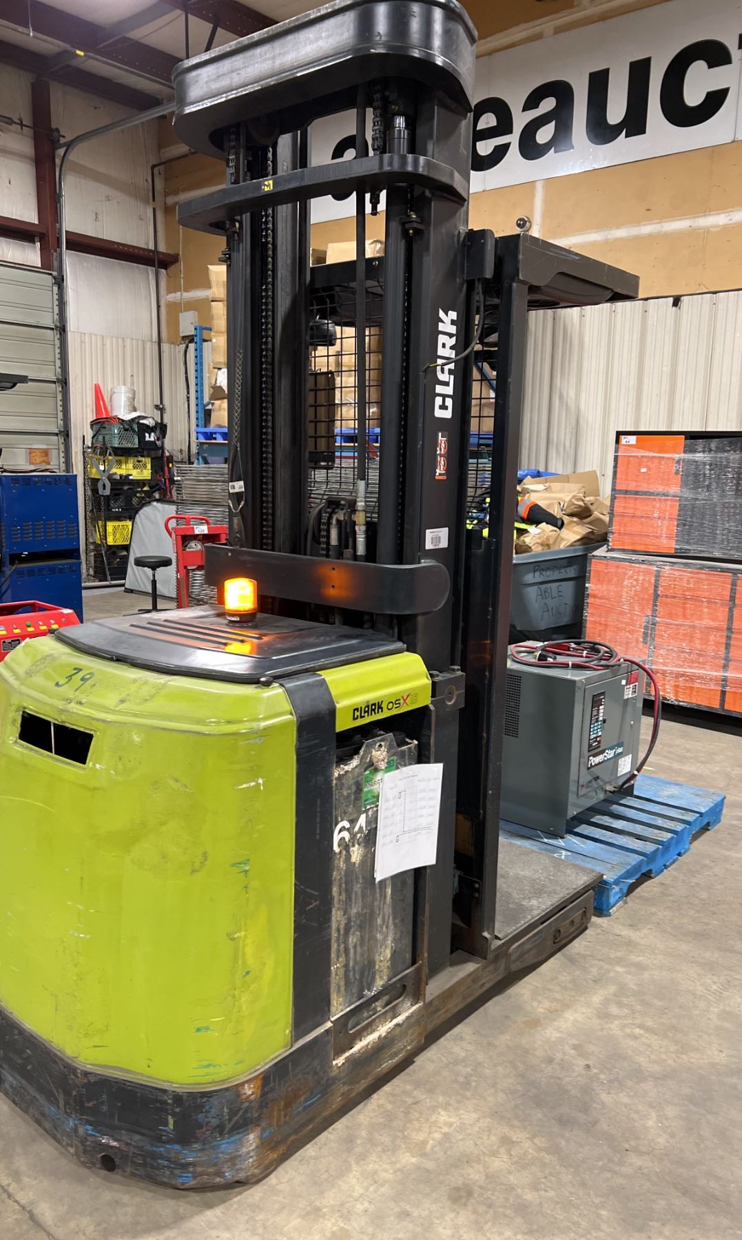 CLARK OSX15 3 STAGE 3000 LBS CAPACITY 600MM MAST HEIGHT 24V ELECTRIC STAND UP ORDER PICKER WITH POWERSTAR SCR2000 INDUSTRIAL 3 PHZ BATTERY CHARGER *HOUR METER READS 8026HR, HOURS NOT VERIFIED*