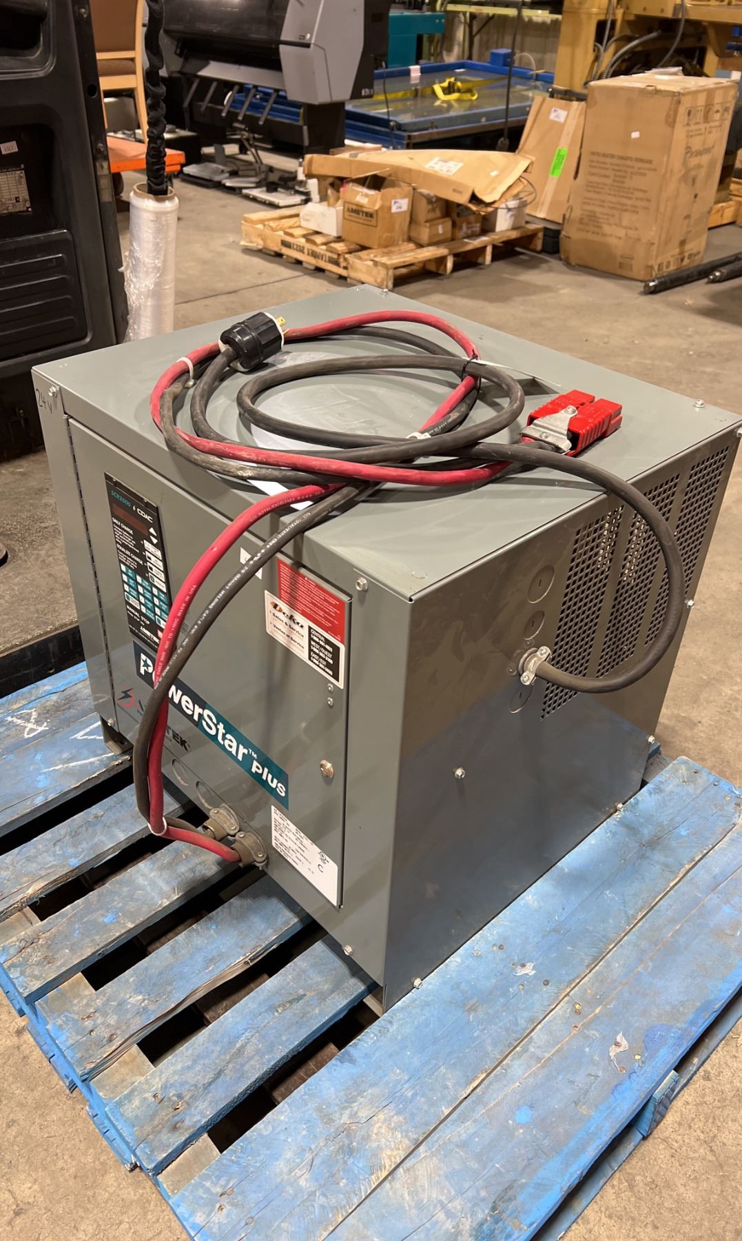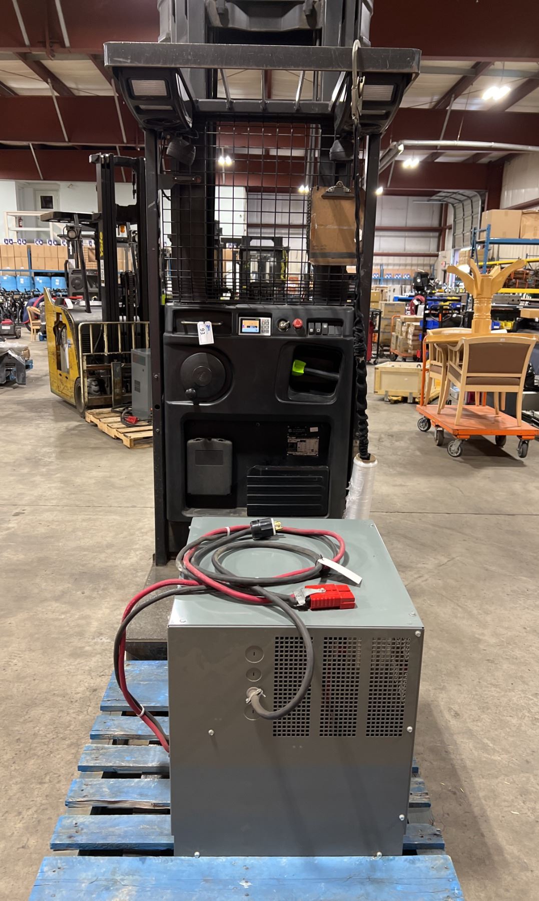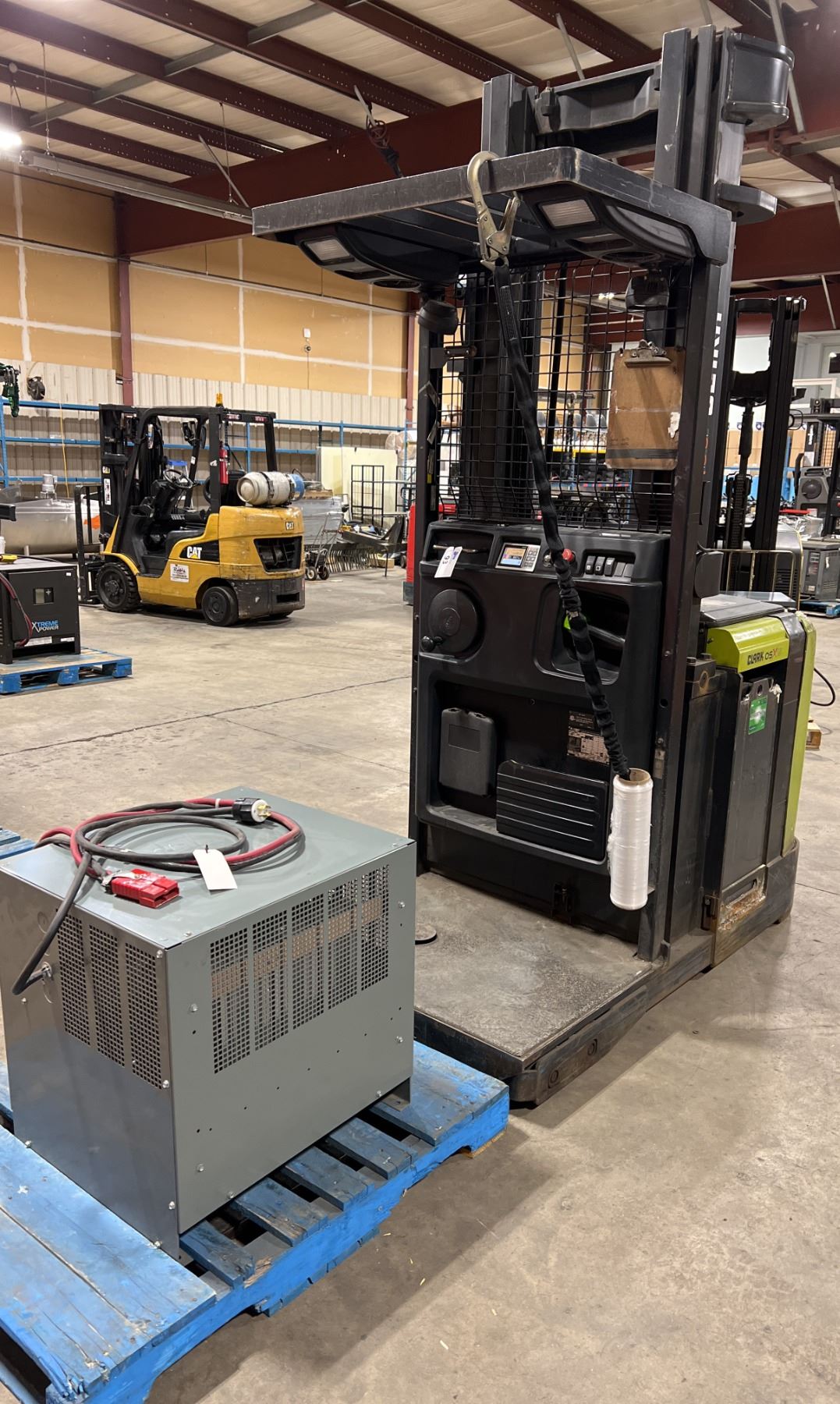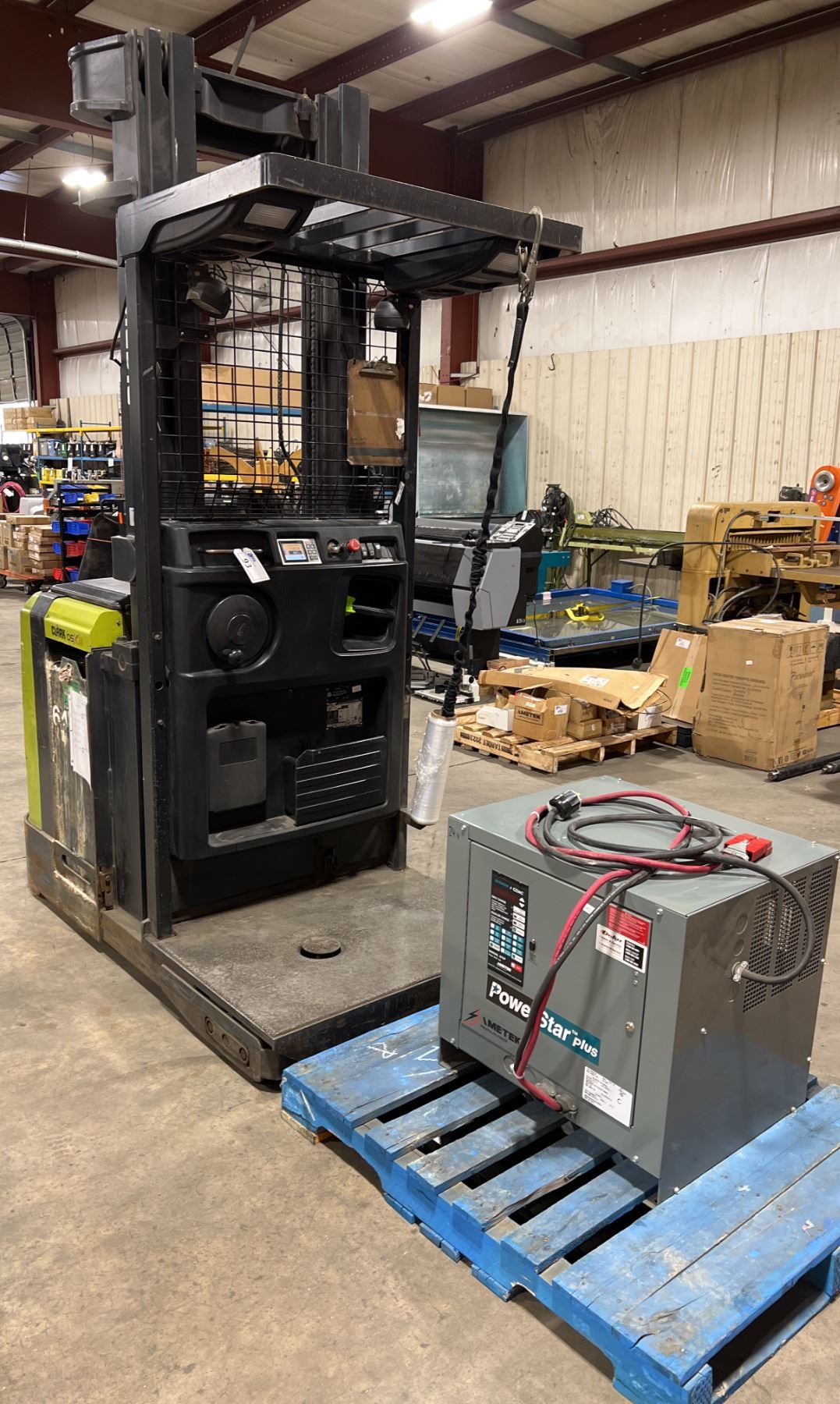 CLARK OSX15 3 STAGE 3000 LBS CAPACITY 600MM MAST HEIGHT 24V ELECTRIC STAND UP ORDER PICKER WITH POWERSTAR SCR2000 INDUSTRIAL 3 PHZ BATTERY CHARGER *HOUR METER READS 8026HR, HOURS NOT VERIFIED*