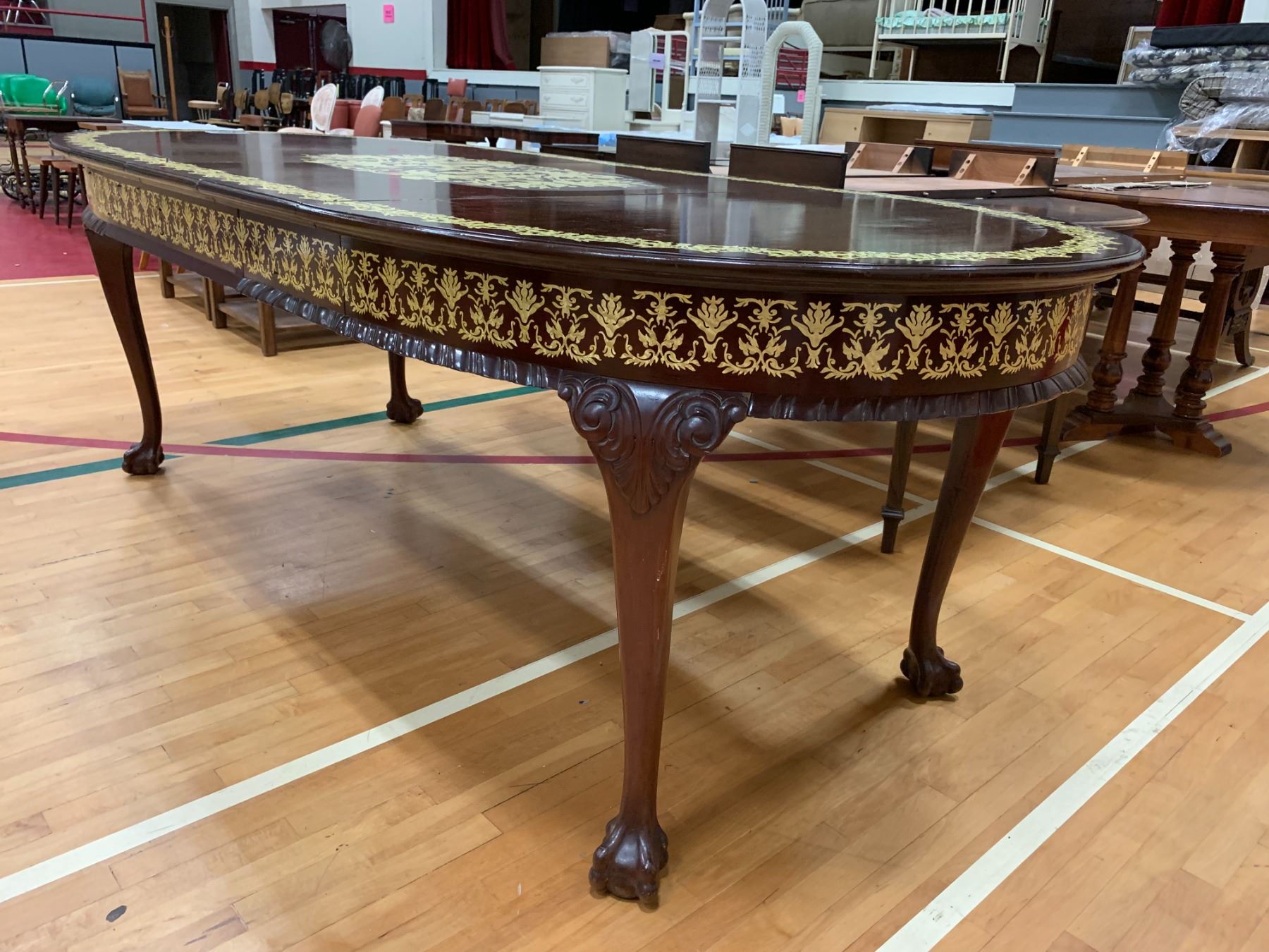 CLAW FOOT INLAID GOLD ACCENT WOOD DINING TABLE APPROX (31"X92"X41") WITH 3 LEAFS