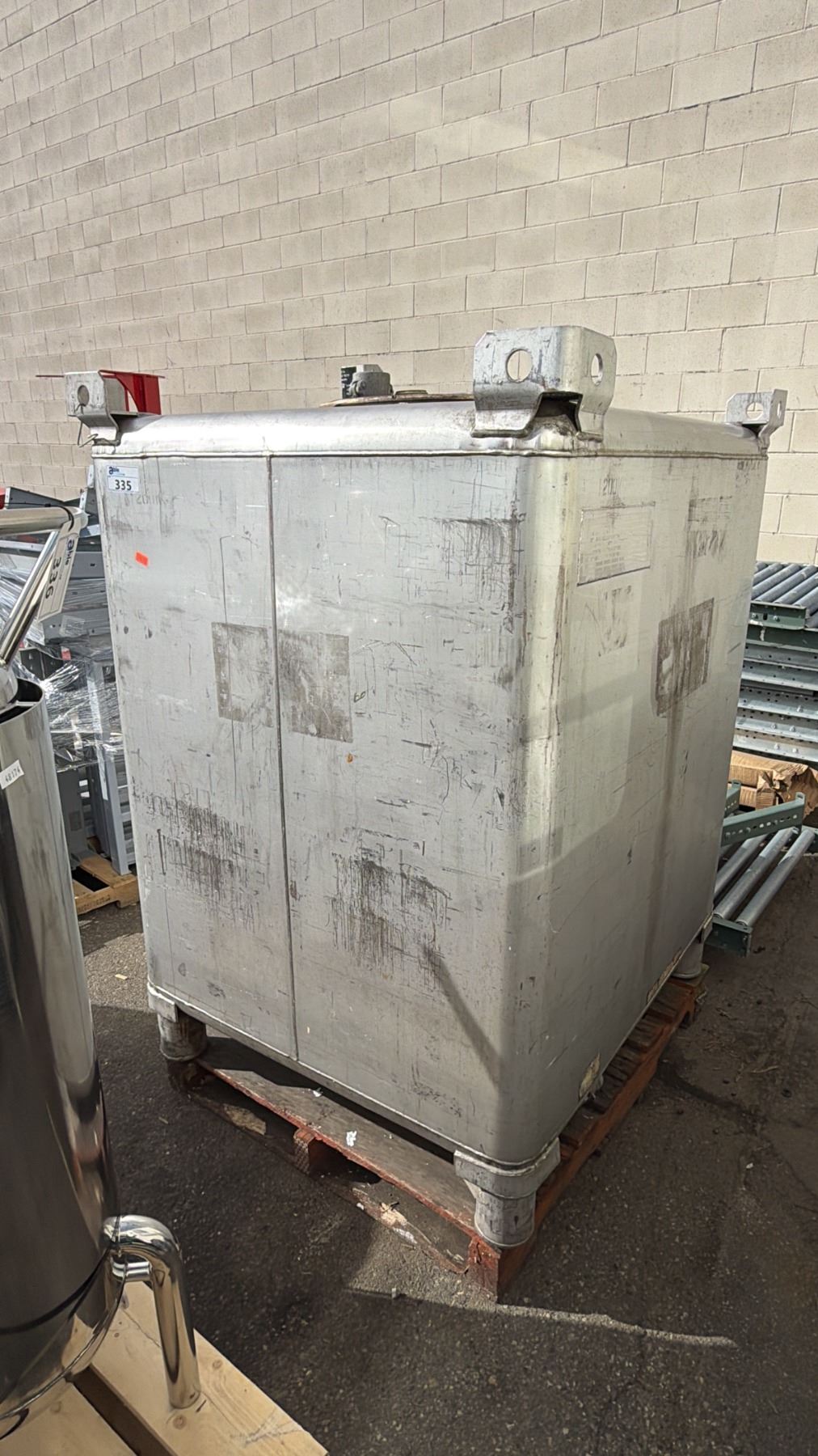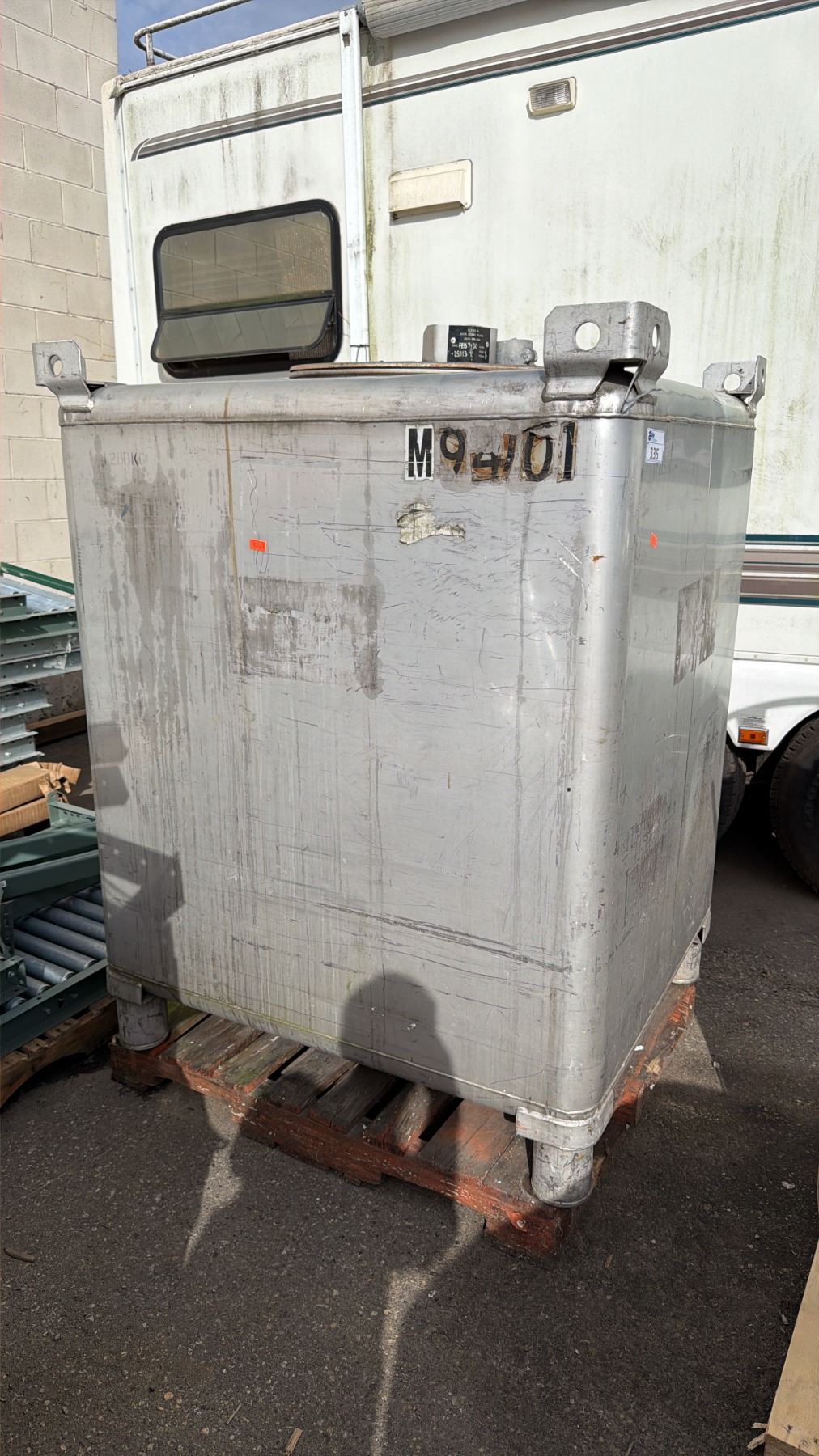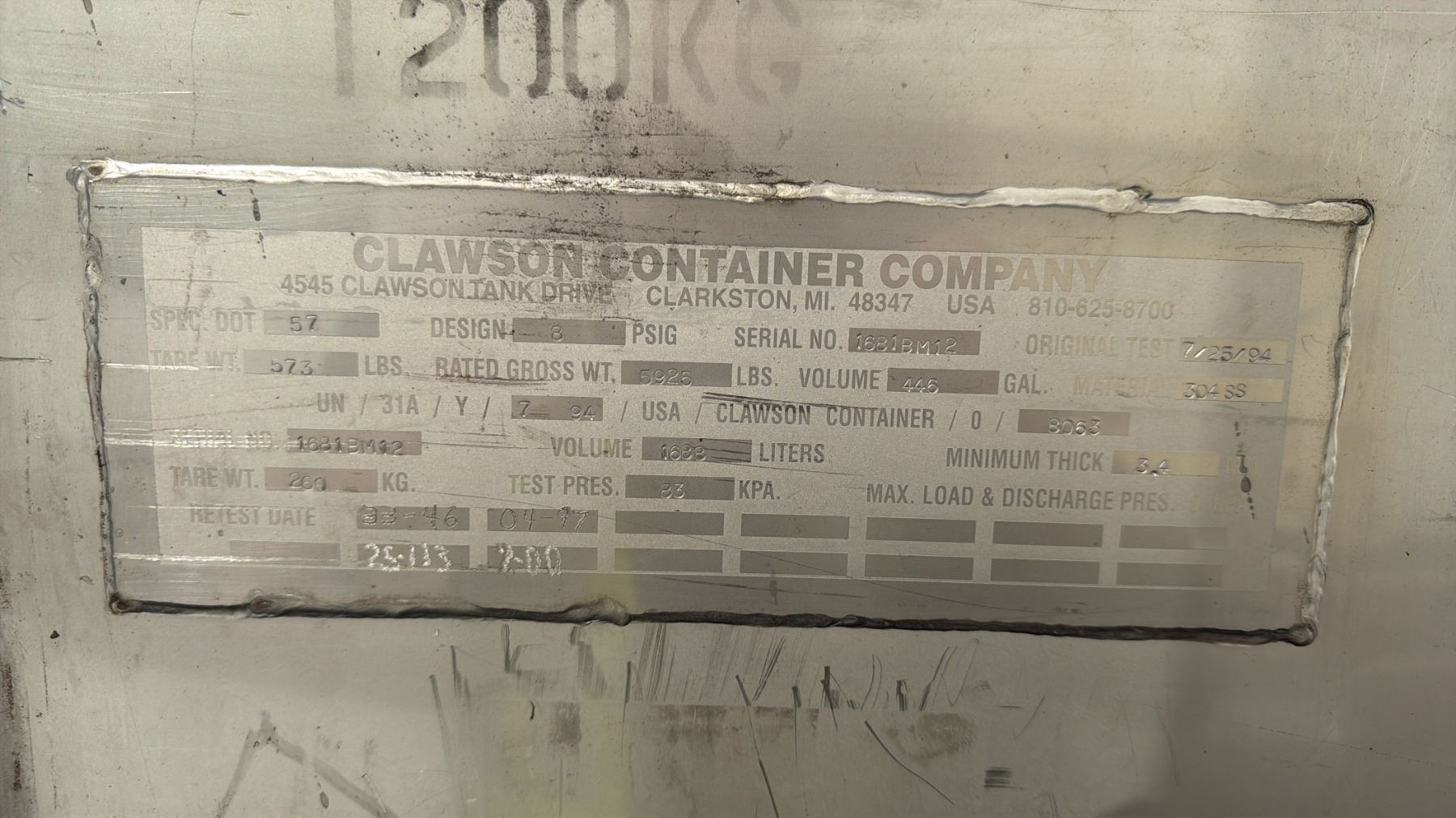 CLAWSON CONTAINER CO. STAINLESS STEEL STORAGE TANK, APPROX 40" X 47" X 63"H 446 GALLON, 573LB