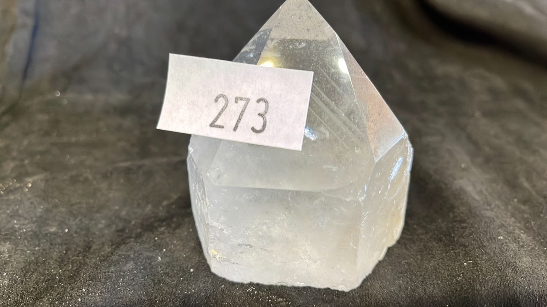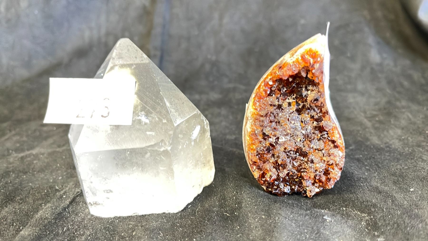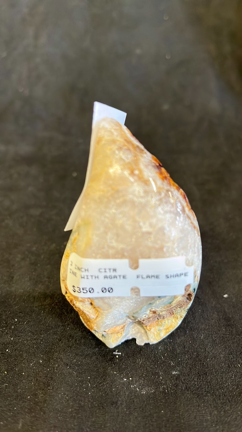 CLEAR QUARTZ WITH INCLUSIONS & 3" CITRINE WITH AGATE FLAME SHAPE