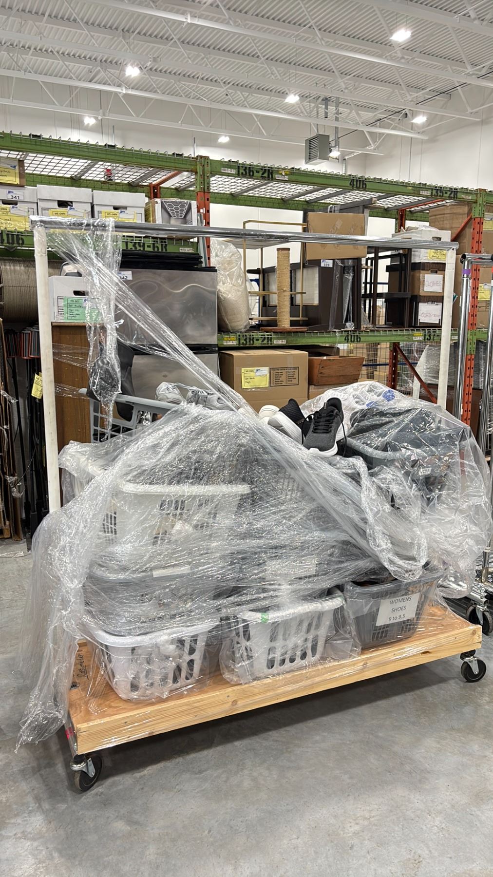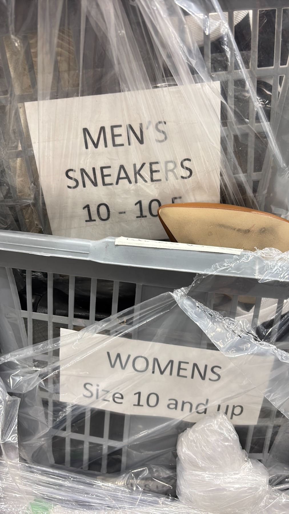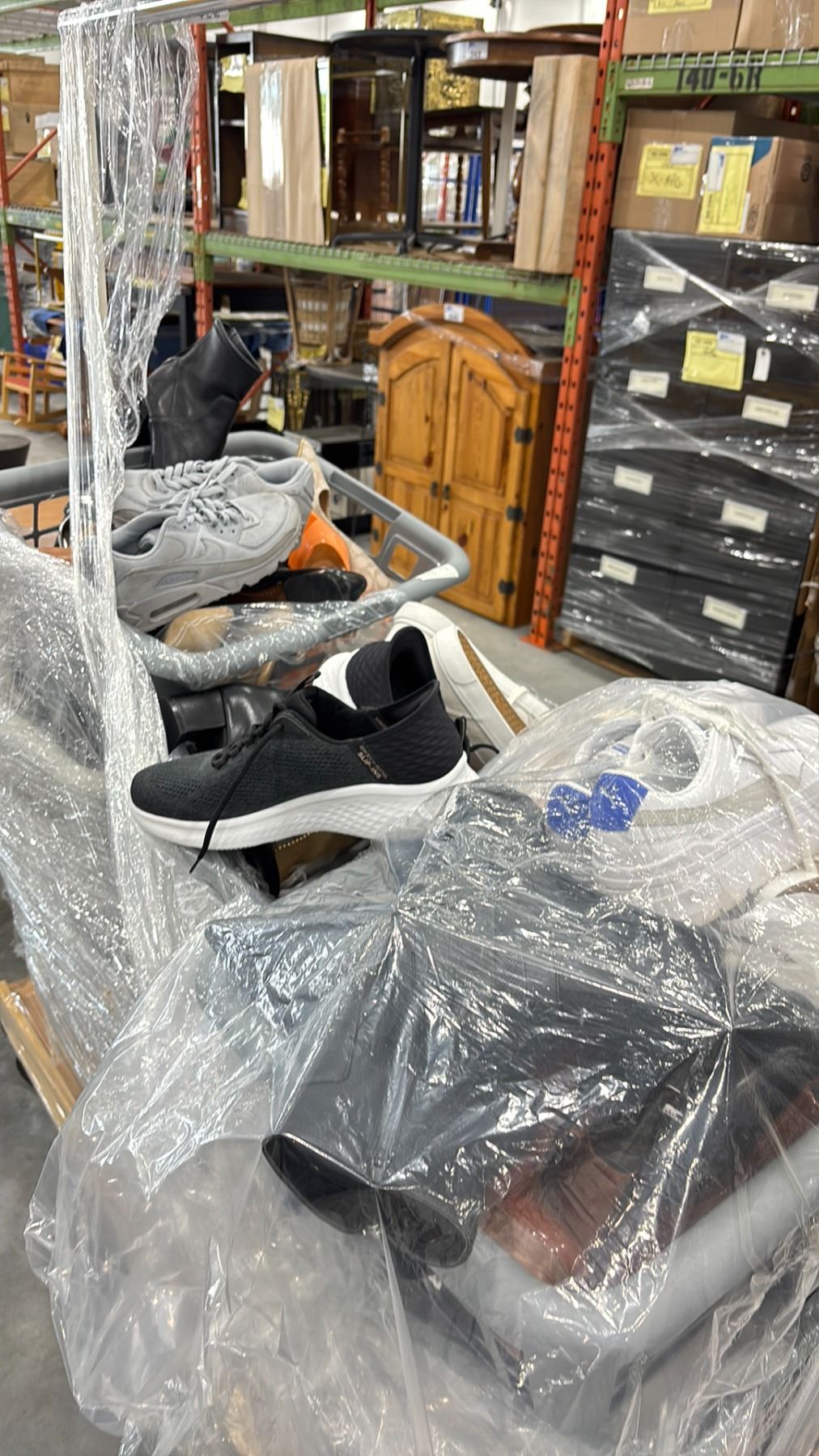 CLOTHING RACK FILLED WITH LAUNDRY BASKETS OF MENS & WOMENS SHOES *RACK INCLUDED & MUST BE TAKEN*