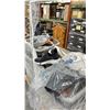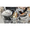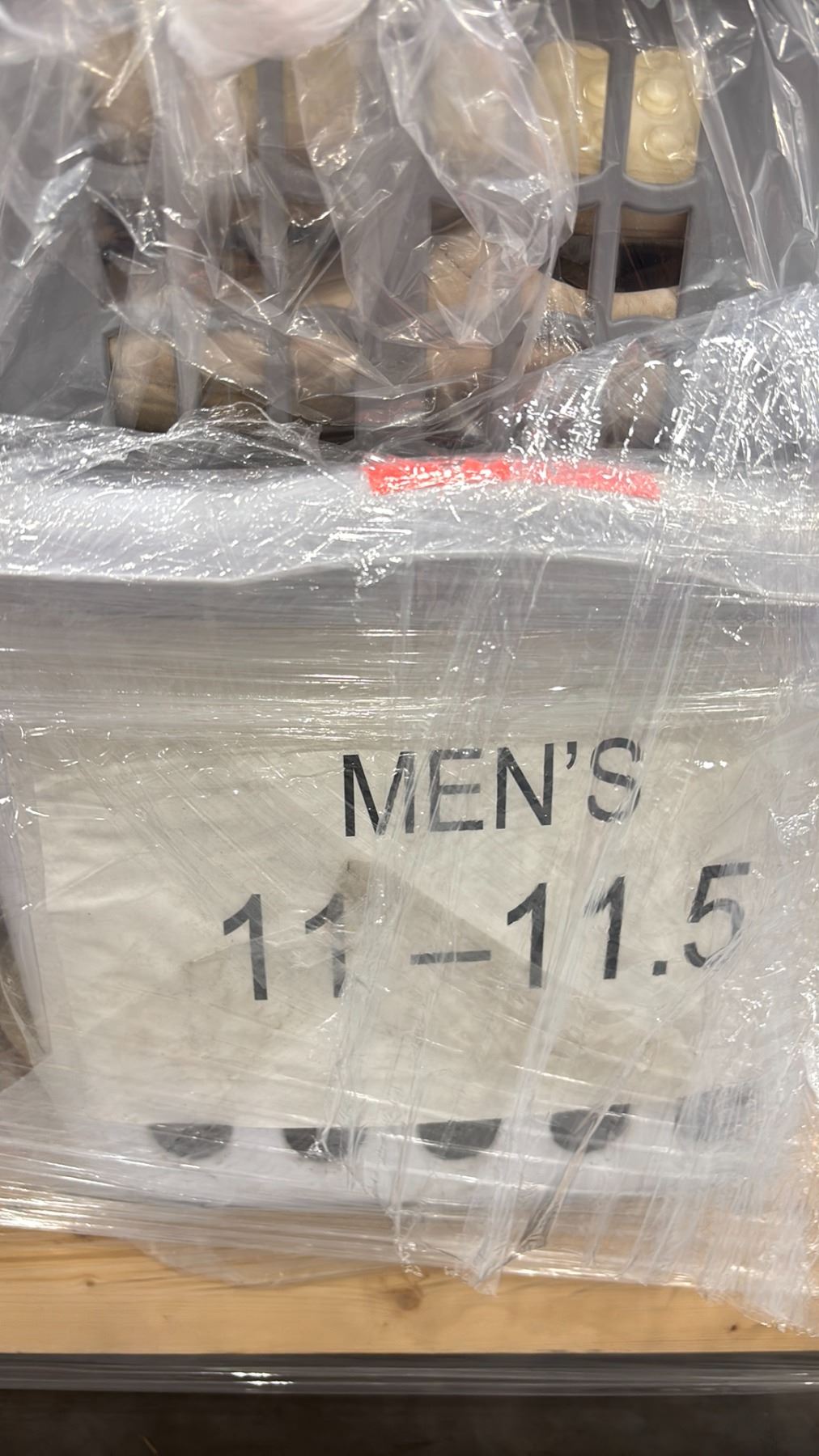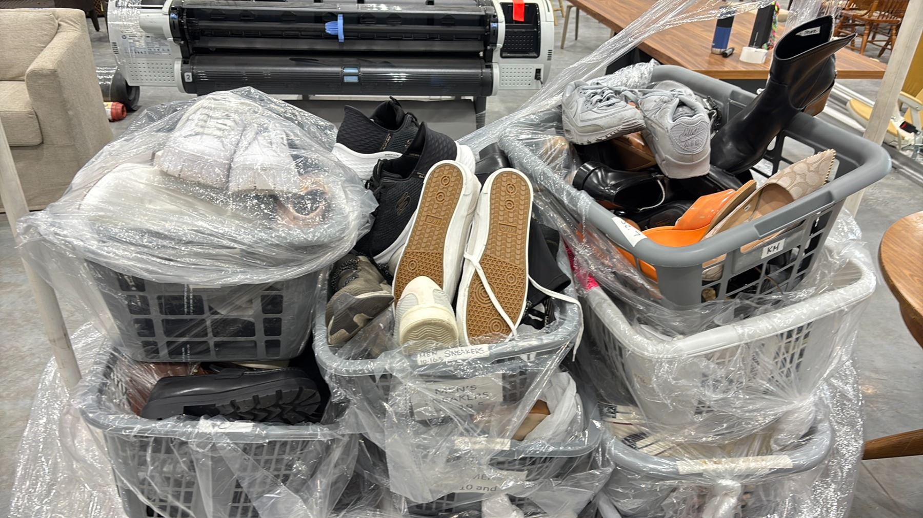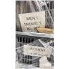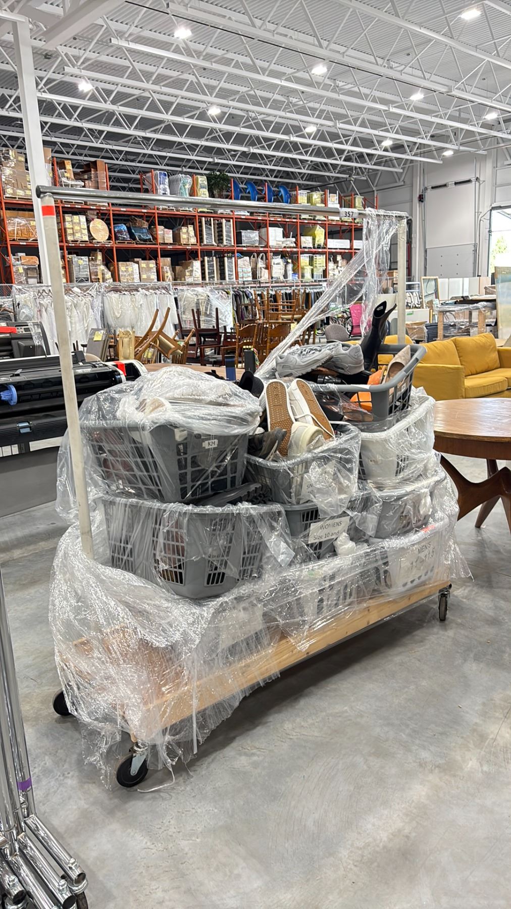 CLOTHING RACK FILLED WITH LAUNDRY BASKETS OF MENS & WOMENS SHOES *RACK INCLUDED & MUST BE TAKEN*