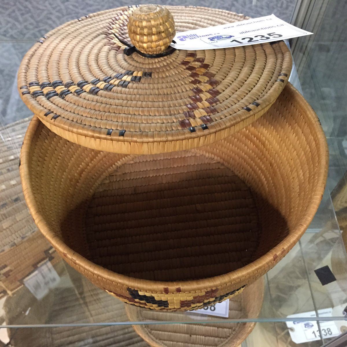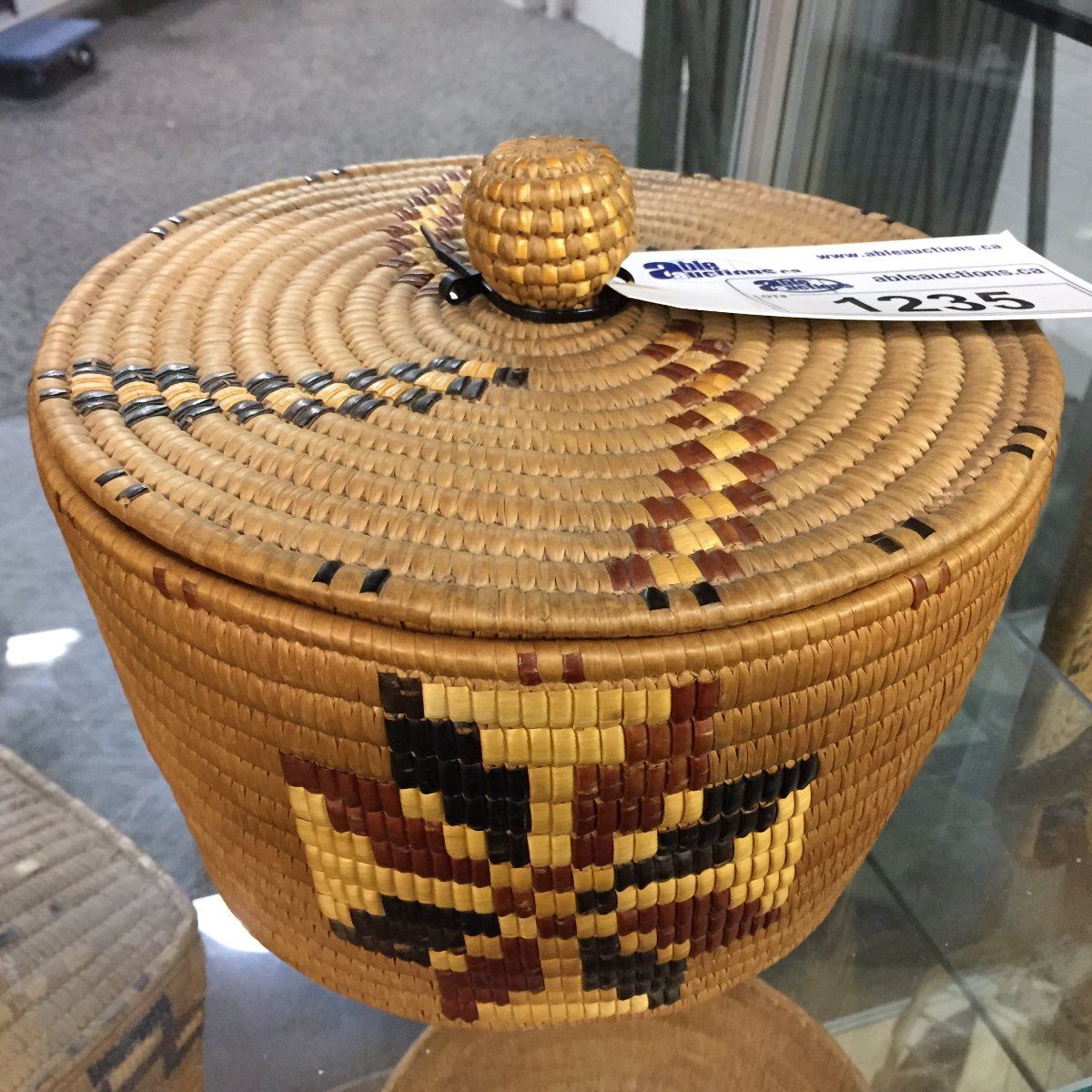 COAST SALISH,  KNOB TOP LIDDED BASKET, WITH "WHIRLWIND" PATTERN 11" DIAMETER X 9" HIGH
