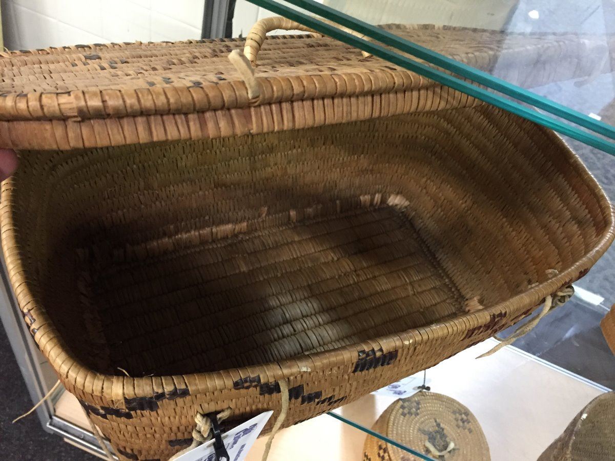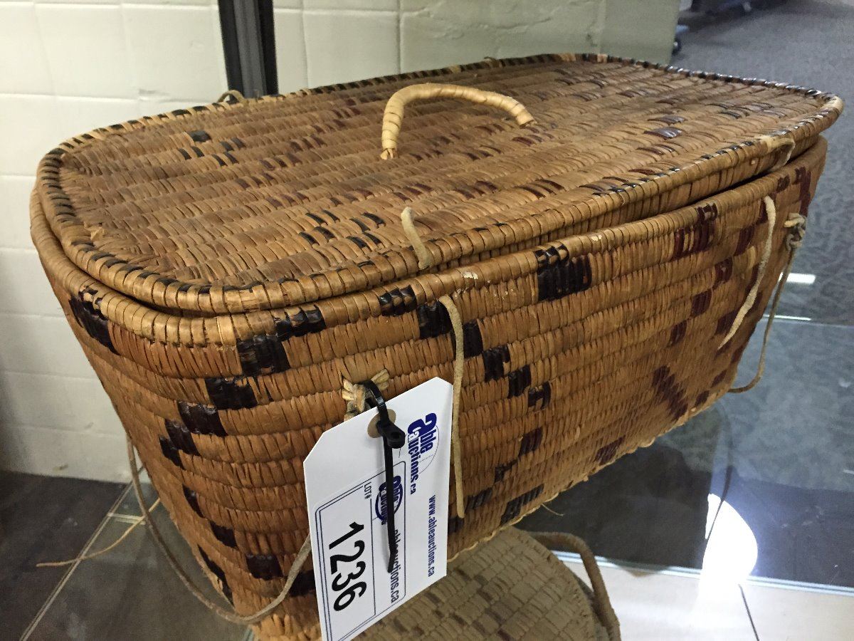 COAST SALISH, LIDDED BASKET, WITH HANDLE 19" W X 11" D X 10" H