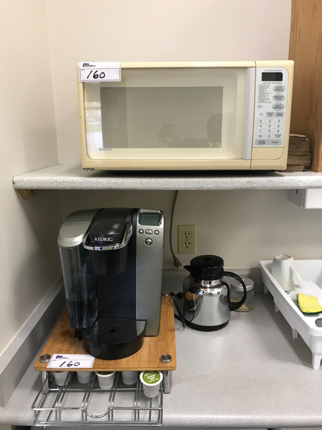 COFFEE STATION CONTENTS-KEURIG, DANBY BAR FRIDGE, MICROWAVE, ELECTRIC KETTLE, CUPS & DISHES,ETC