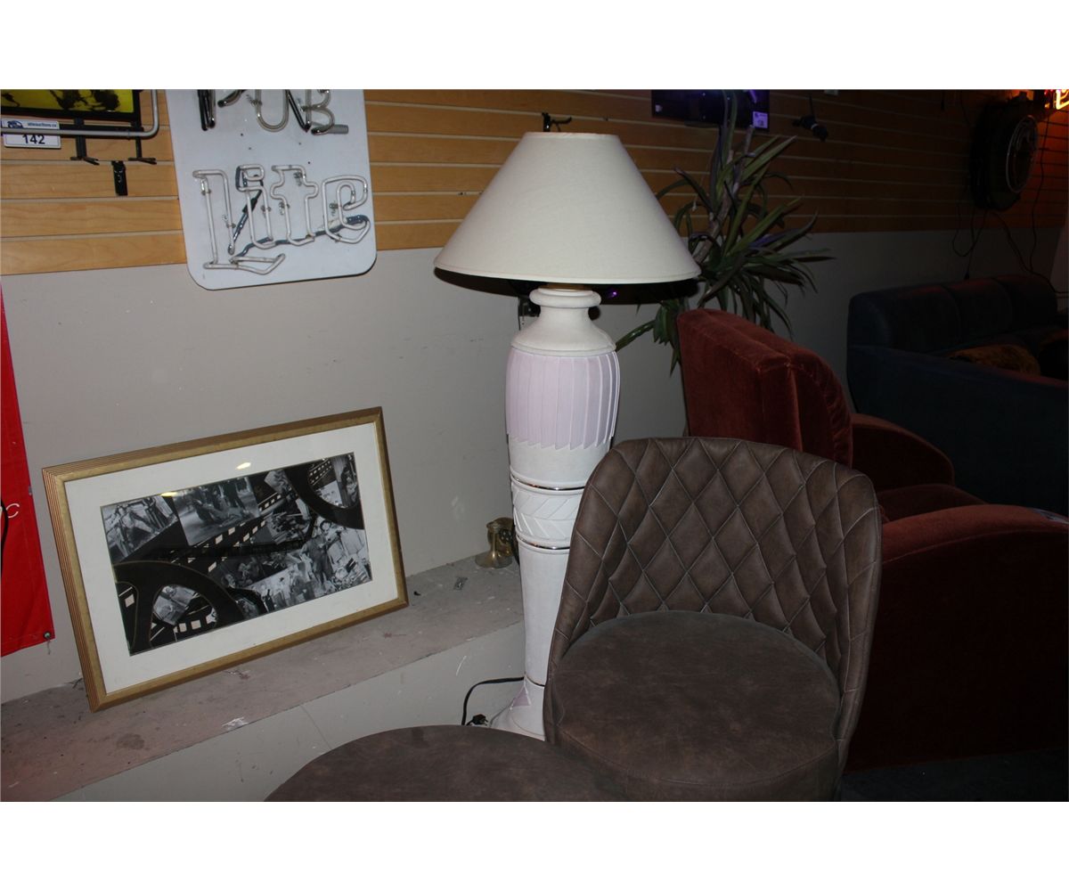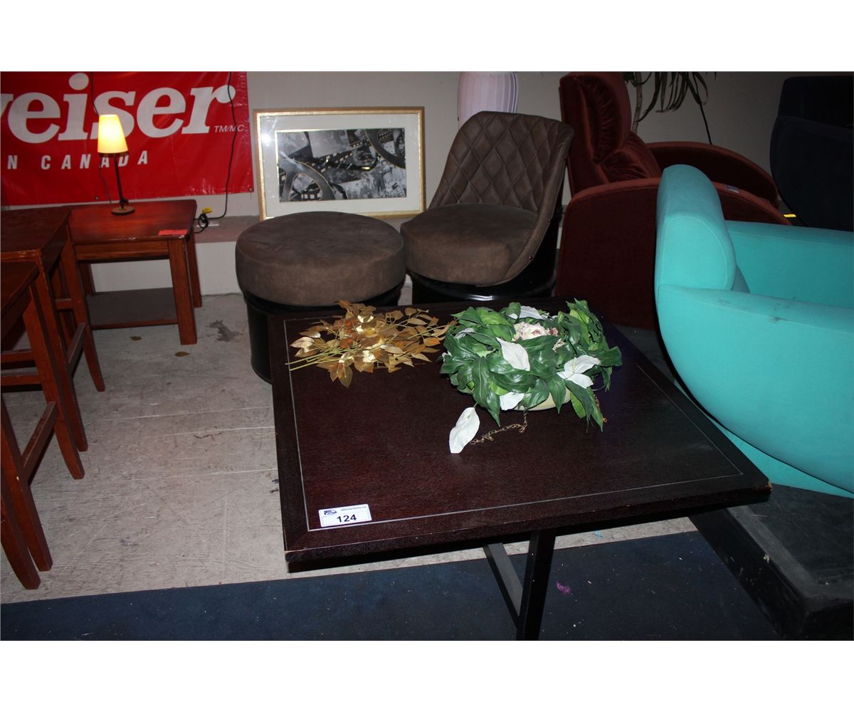 COFFEE TABLE, TUB CHAIR WITH OTTOMAN,FLOOR LAMP, 3 STOOLS AND END TABLE