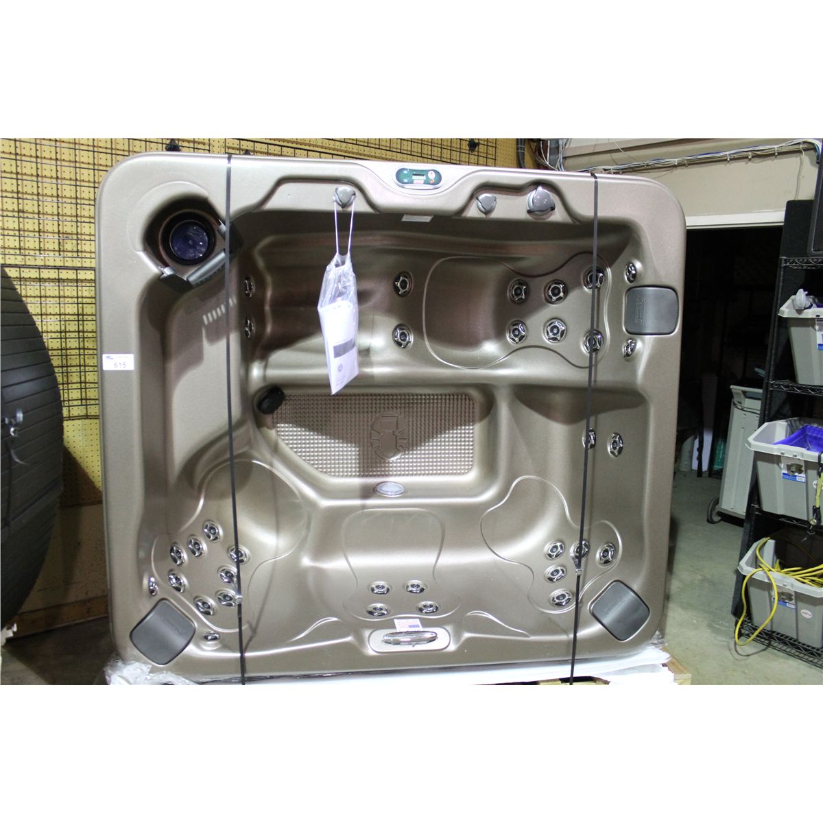 COLEMAN HERITAGE SERIES HOT TUB, 84X74X36 PREFERRED SMOKE CABINET WITH CINNABAR INTERIOR C/W 33 SS STAR FIRE JETS, 3 PILLOWS, 50 SQ FT SURFACE FILTER WITH WEIR GATE, GATE VALVE, LED WATERFALL WITH CONTROL VALVE, 5.5 KW HEATER, 5 BHP 2 SPEED PUMP, LED SPA