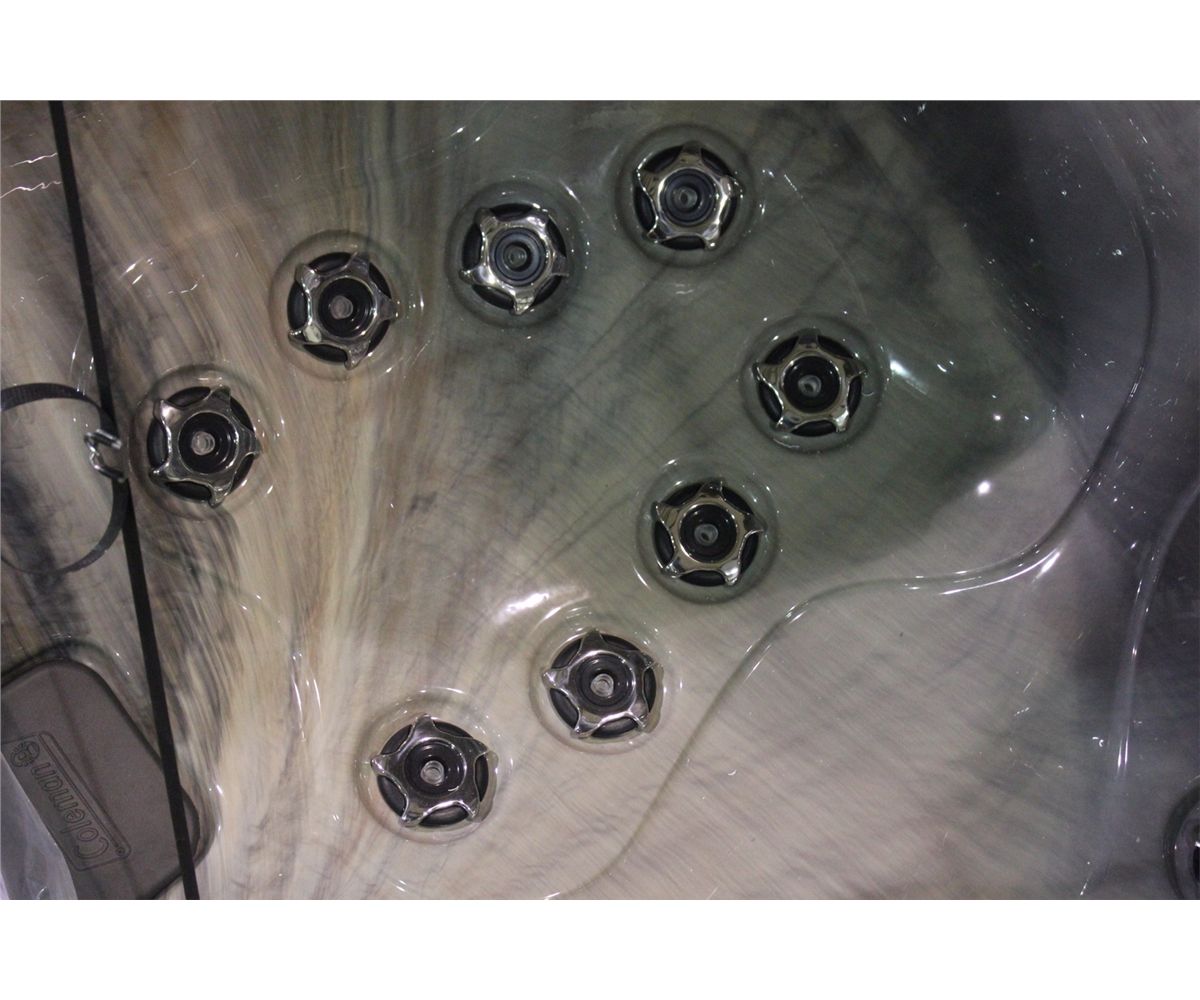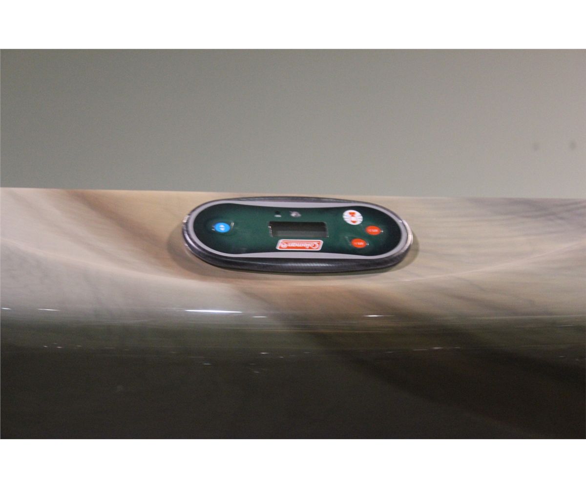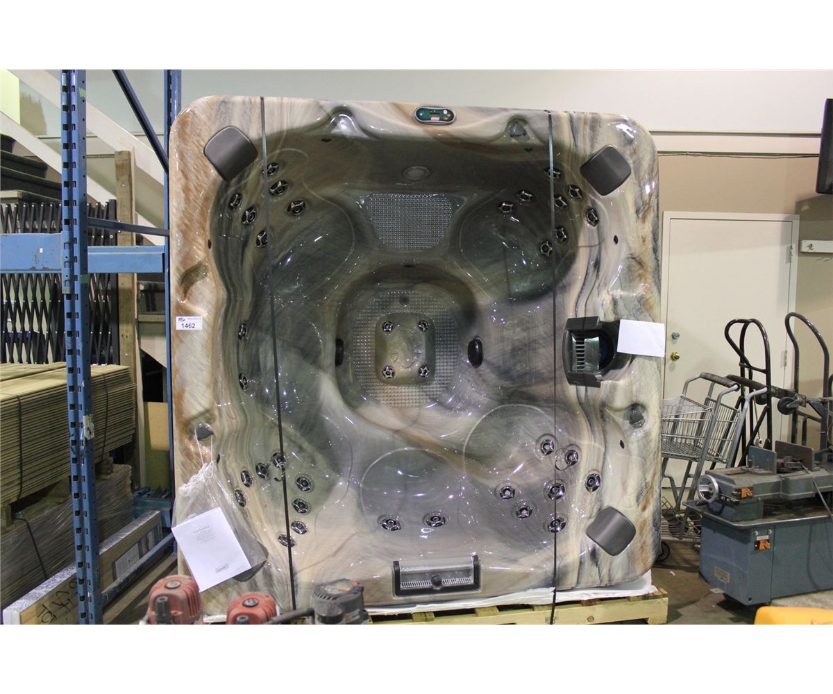 COLEMAN HERITAGE SERIES HOT TUB, 84X84X36" PREFERRED SMOKE CABINET WITH TUSCAN SUN INTERIOR C/W 37 BLACK STAR FIRE JETS, 4 PILLOWS, 75 SQ FT PURE FLOW SURFACE FILTER WITH WEIR GATE, SPILL OVER WATERFALL, TITANIUM 5.5KW HEATER, 2 X 5 BHP PUMPS