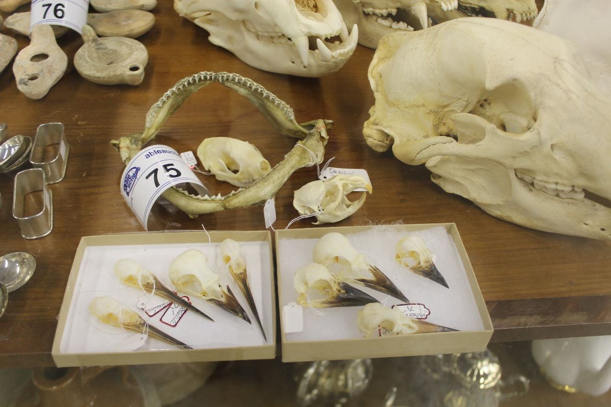 COLLECTION OF 11 PIECES INC. EGRET, SUNBIRD, MAGPIE AND MUSKRAT SKULLS, AND SHARK JAW