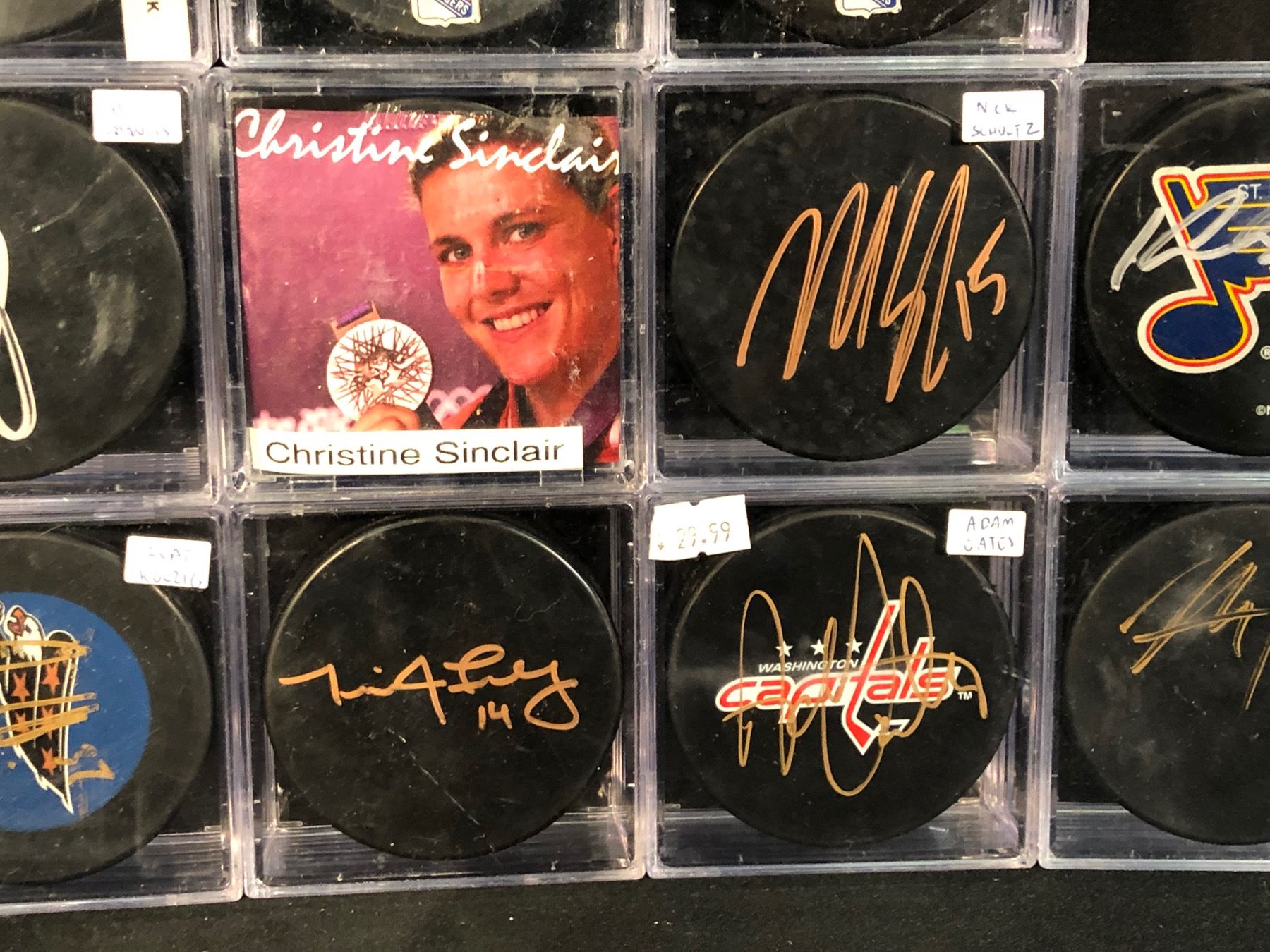 COLLECTION OF 13 SIGNED NHL AUTOGRAPHED TEAM PUCKS IN PROTECTIVE CASES, SEE PICTURES TO VIEW AUTOGRAPHS