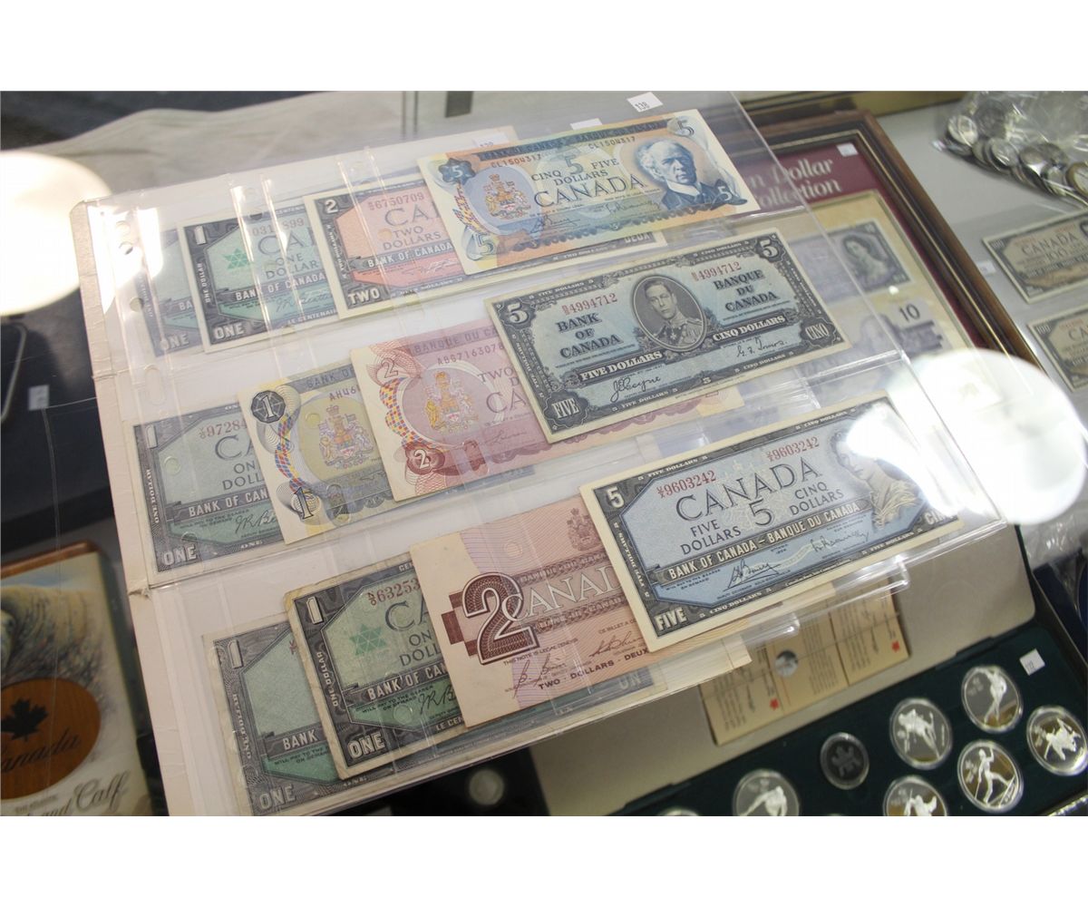 COLLECTION OF 3- $5 CANADIAN BANKNOTES, 3- $2 CANADIAN BANKNOTES AND 6- $1 CANADIAN BANK NOTES 12 NOTES IN TOTAL, HIGH GRADE