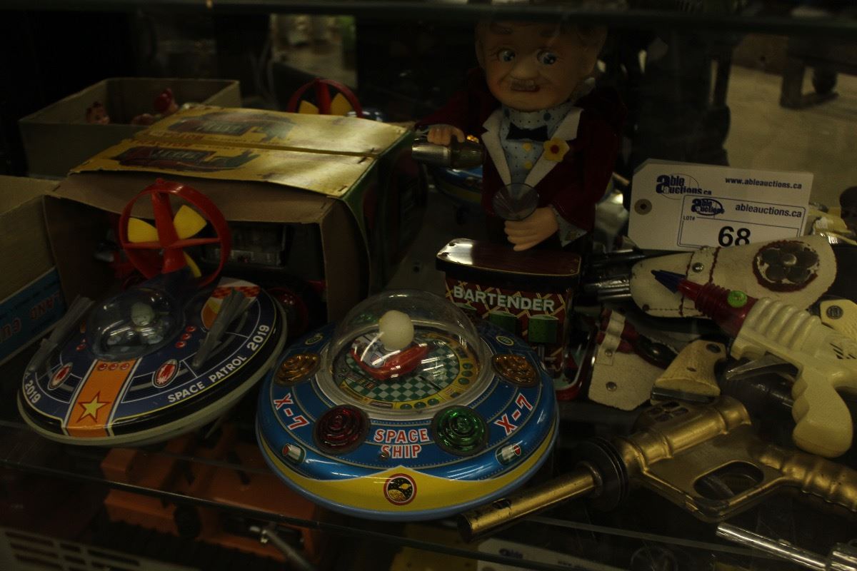 COLLECTION OF 5 VARIOUS TOYS INC. BATTERY OPERATED VEHICLES, SPACE TOYS, RAY GUNS AND WESTERN GUNS