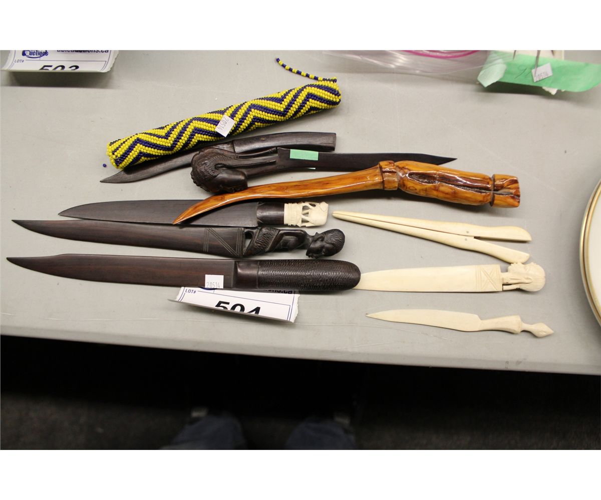 COLLECTION OF AFRICAN BONE AND WOOD LETTER OPENERS AND BEADED WORK