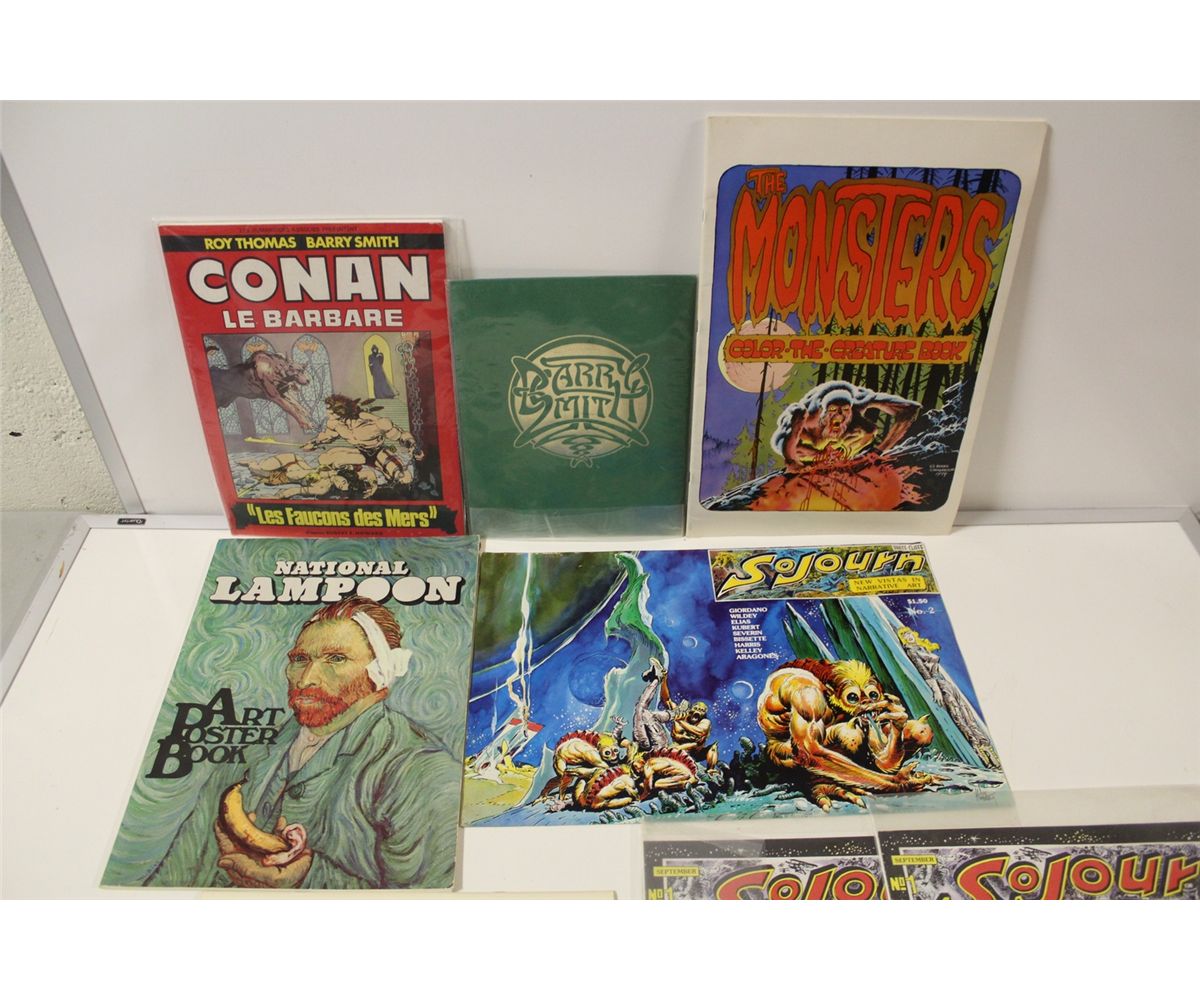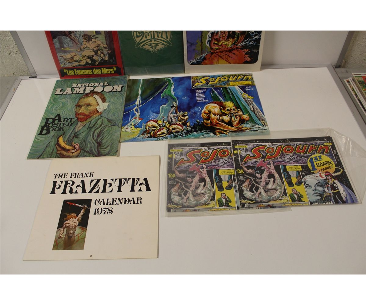 COLLECTION OF ASSORTED PUBLICATIONS INCL: GORBLIMEY PRESS SHELF STUFF- BARRY SMITH, NATIONAL LAMPOON ART POSTER BOOK, FRANK FRAZETTA 1978 CALENDAR, SOJOURN #1 (X2) & #2,