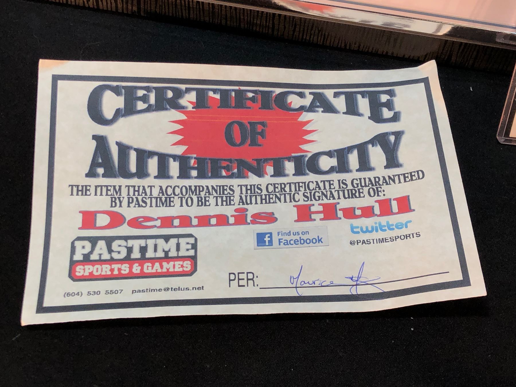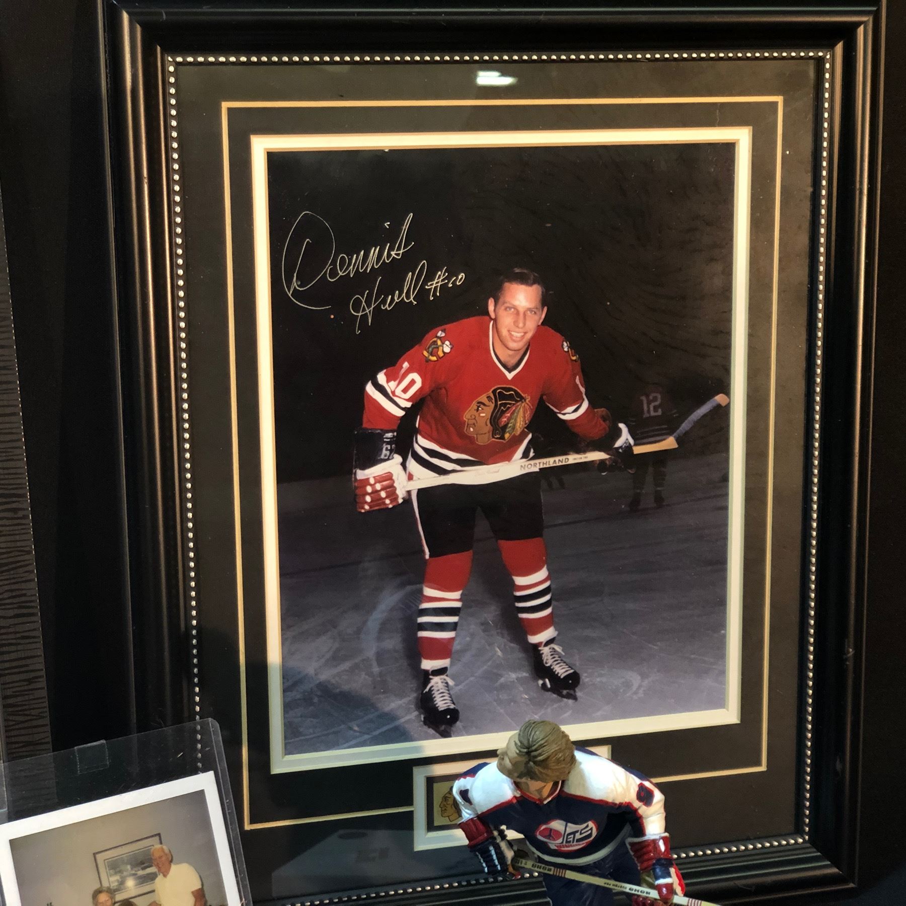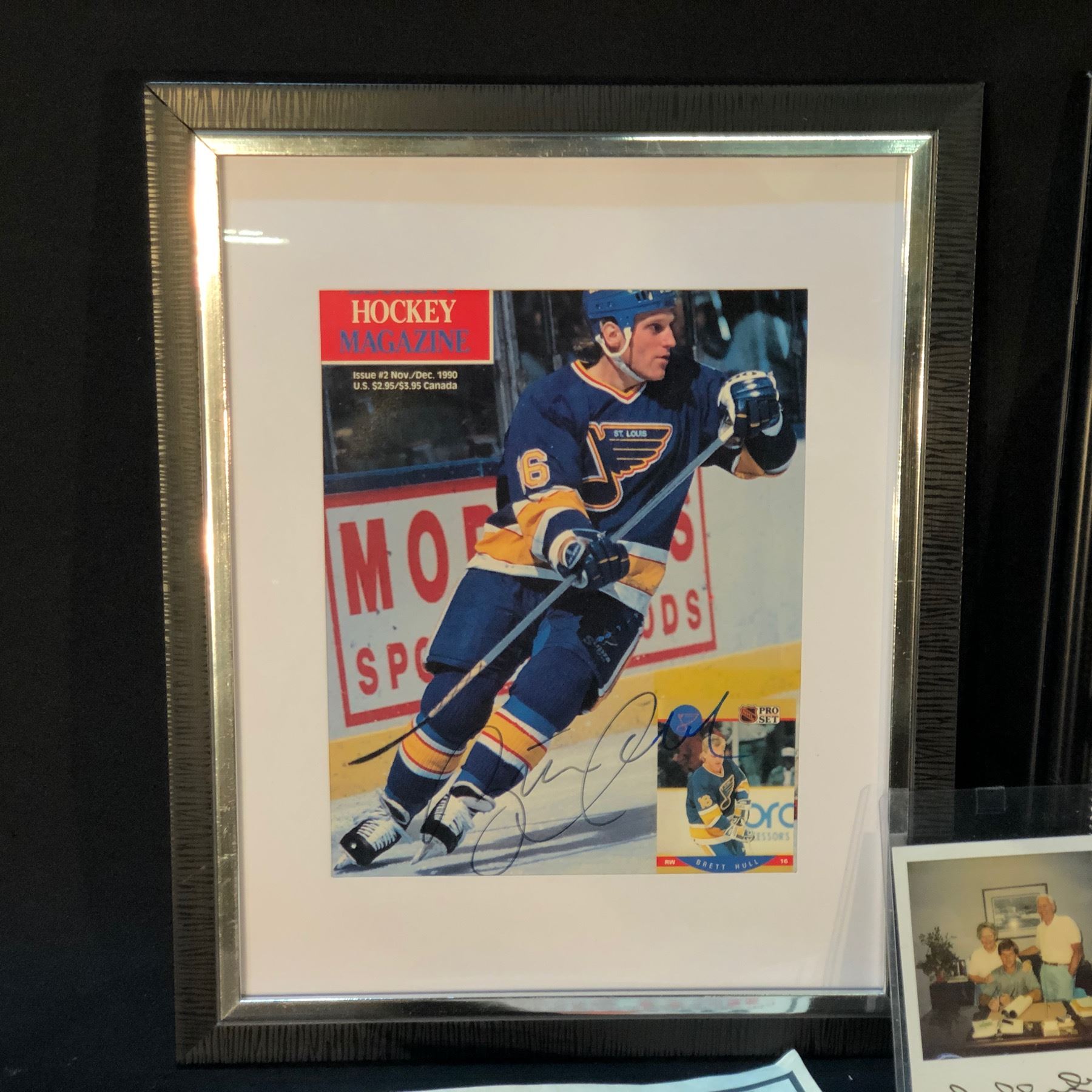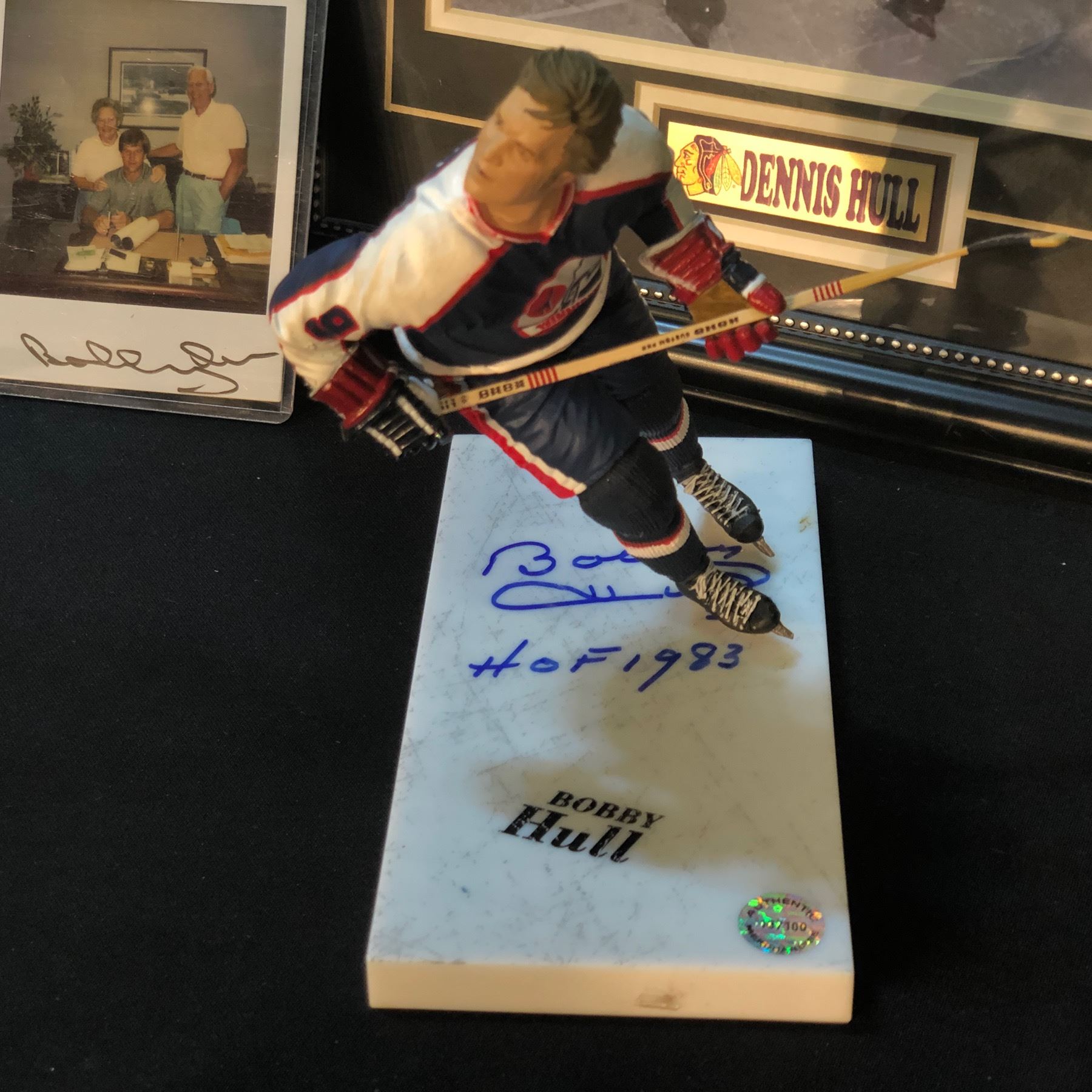 COLLECTION OF AUTOGRAPHED HULL FAMILY HOCKEY MEMORABILIA INC. PIECES SIGNED BY BOBBY HULL, BRETT HULL, AND DENNIS HULL
