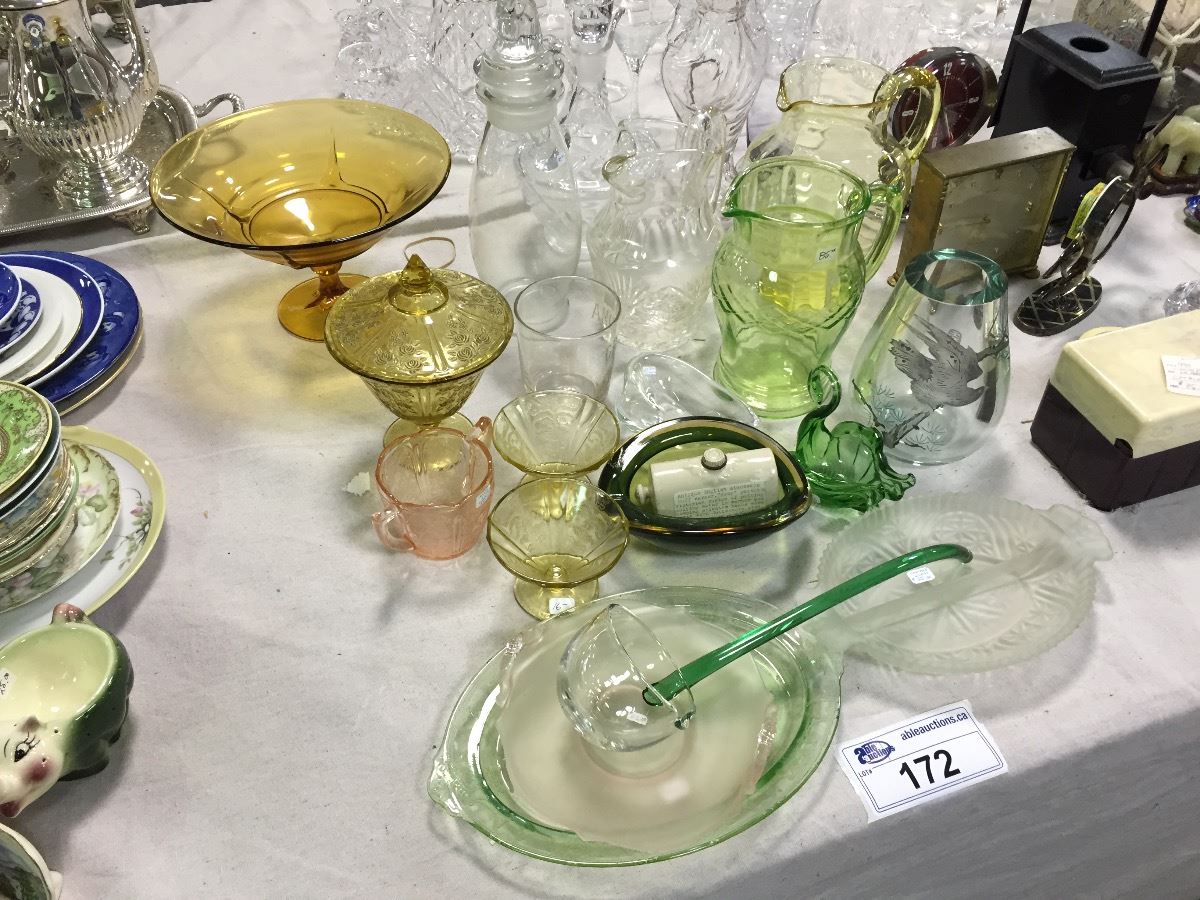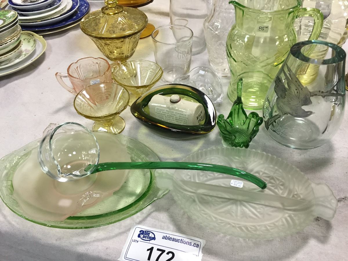 COLLECTION OF: DEPRESSION GLASS, CAMPHOR GLASS, AND MORE