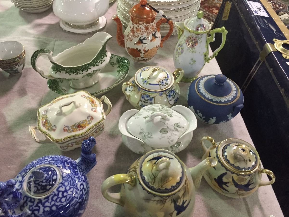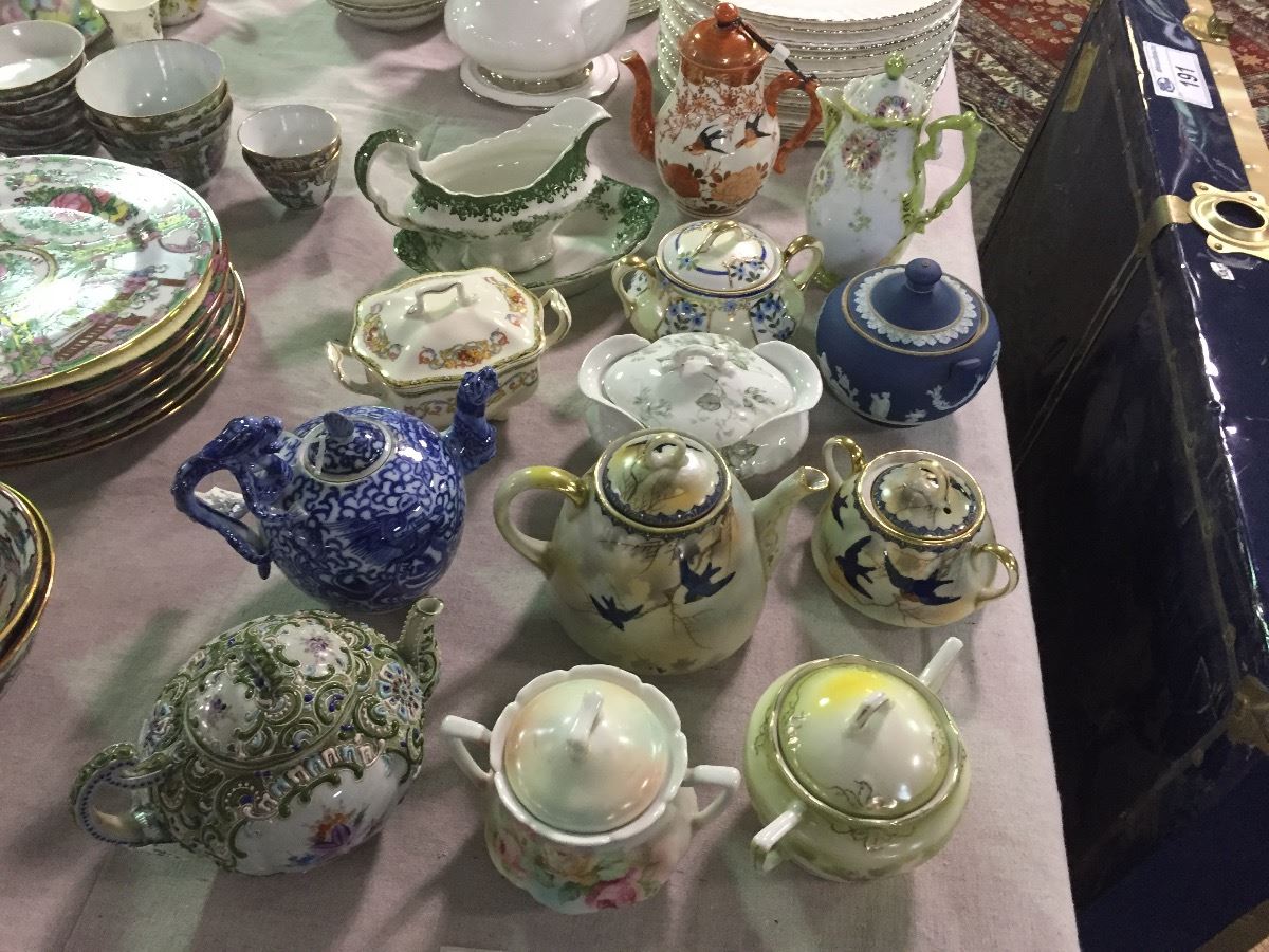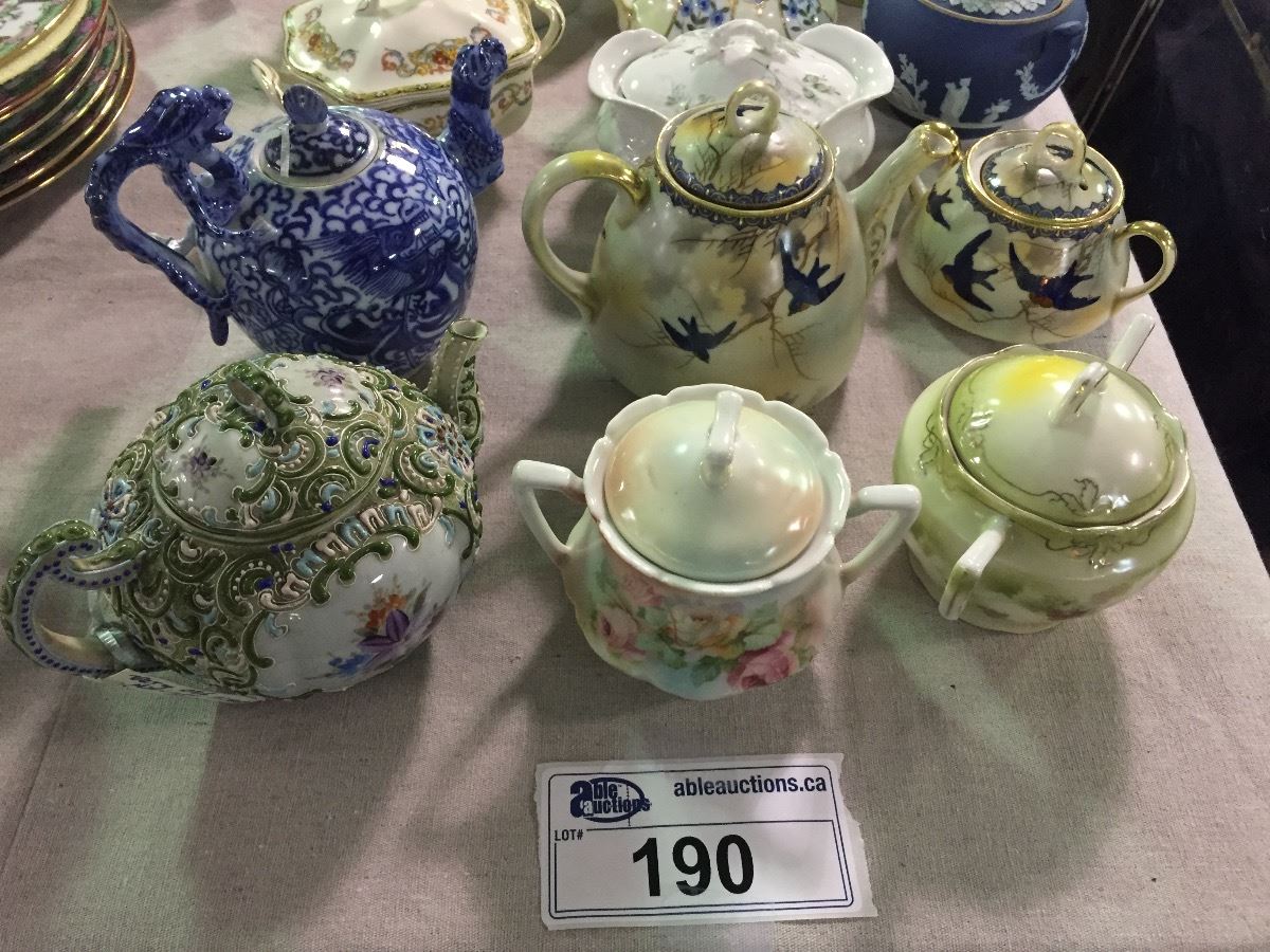 COLLECTION OF: HAND PAINTED TEA POTS, WEDGEWOOD, AND MORE