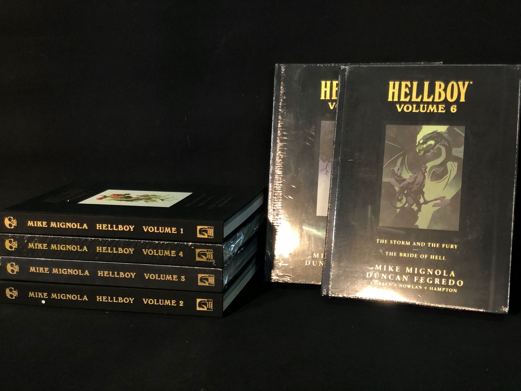 COLLECTION OF HELLBOY ITEMS INC. HELLBOY VOLUMES 1-6 HARDCOVER BOOKS IN ORIGINAL PLASTIC WRAP, AND 2 HELLBOY FIGURINES IN ORIGINAL PACKAGING