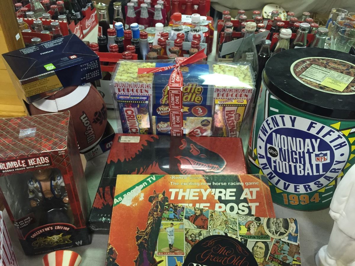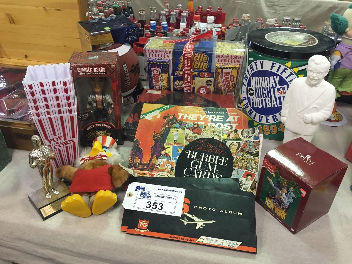 COLLECTION OF MISC COLLECTABLES INCL. DOLLS, NATIVE BLANKET BOX, CFL FOOTBALL AND MORE!