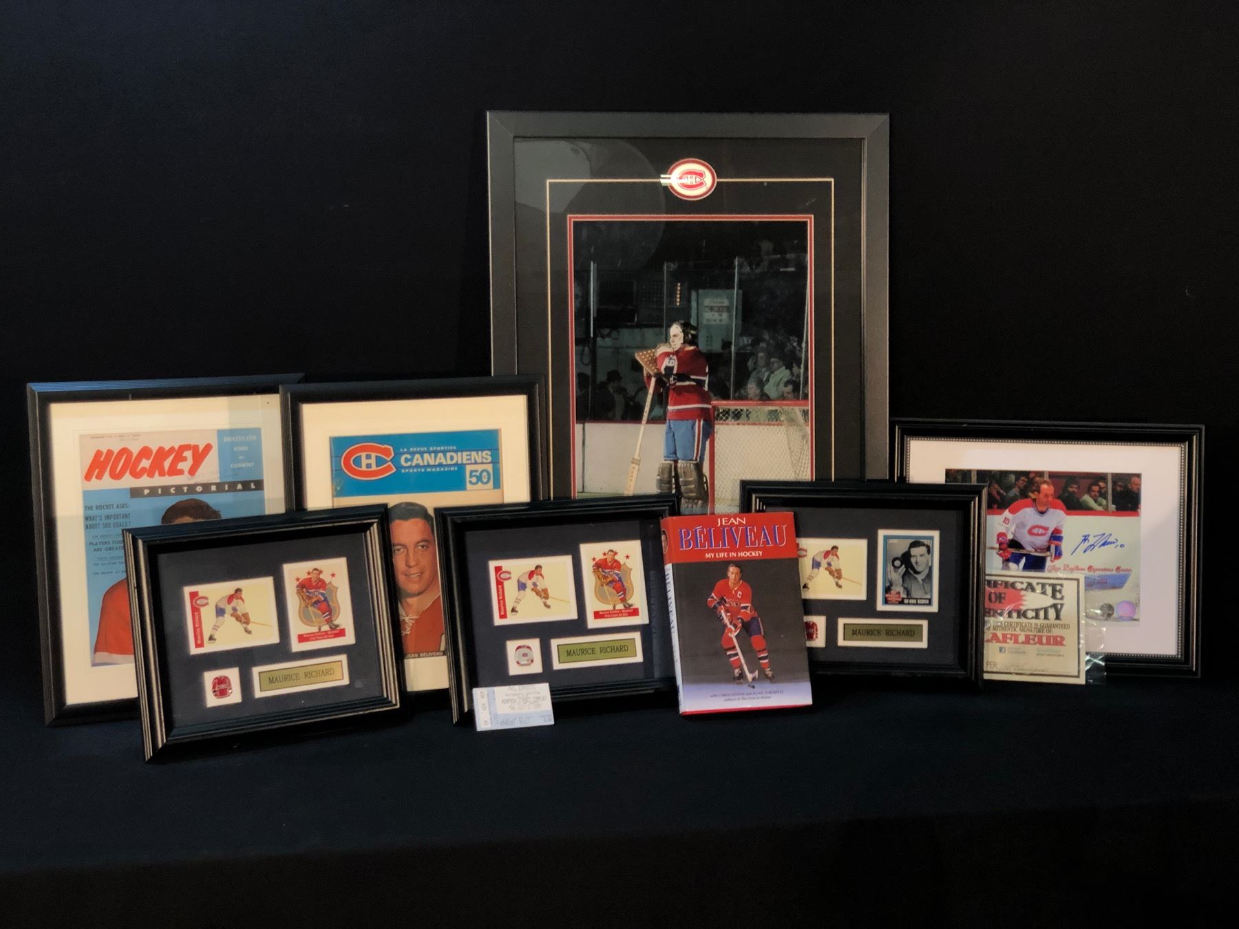 COLLECTION OF MONTREAL CANADIENS VINTAGE MEMORABILIA INC. FROM MAURICE RBELIVEAU BOOK ALSO SIGNED ON INSIDEICHARD, JEAN BELIVEAU, GUY LAFLEUR (SIGNED), AND KEN DRYDEN, JEAN