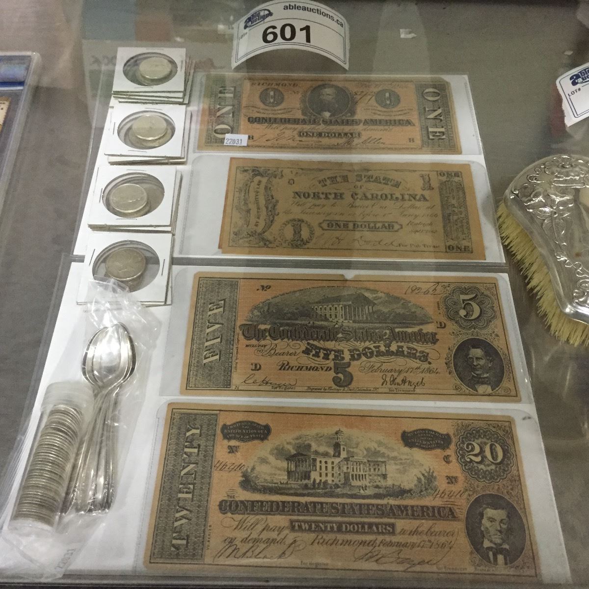 COLLECTION OF SILVER COINS, DIMES, QUARTERS AND ANTIQUE BANK NOTES