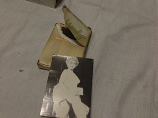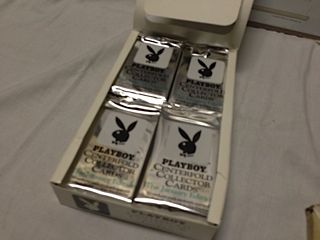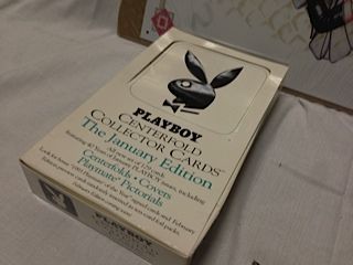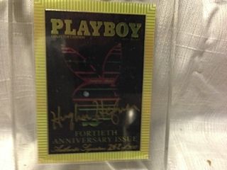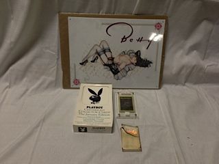 COLLECTOR LOT  WITH VARY RARE LMT. ED. HUGH HEFNER SIGNED PLAYBOY CARD -  BOX OF PLAYBOY TRADING CARDS -  BETTY PAGE 'OLIVIA ART' TIN SIGN AND PACK OF MARILYN MONROE TRADING CARDS -  BOX IN POOR CONDITION