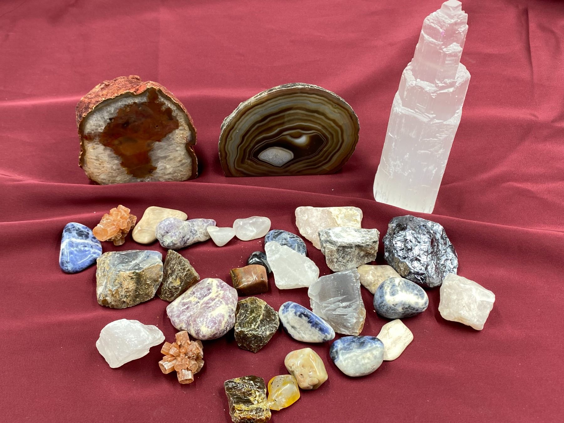 COLLECTORS SET; BRAZILIAN AGATES, LEPIDOLITE, AMBER, SODALITE, BC AGATES, PINK QUARTZ, PEACH CALCITE, ARAGONITE, WHITE CALCITE, SELENITE TOWER, SILICON
