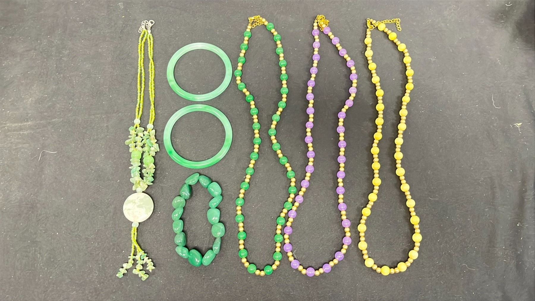 COLORFUL JADE NECKLACE X4 AND 2 GREEN BANGLES