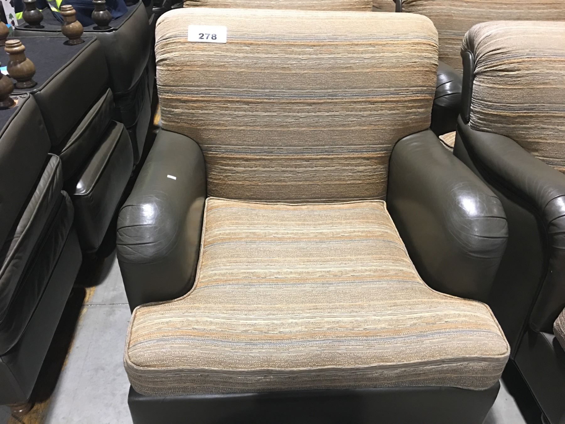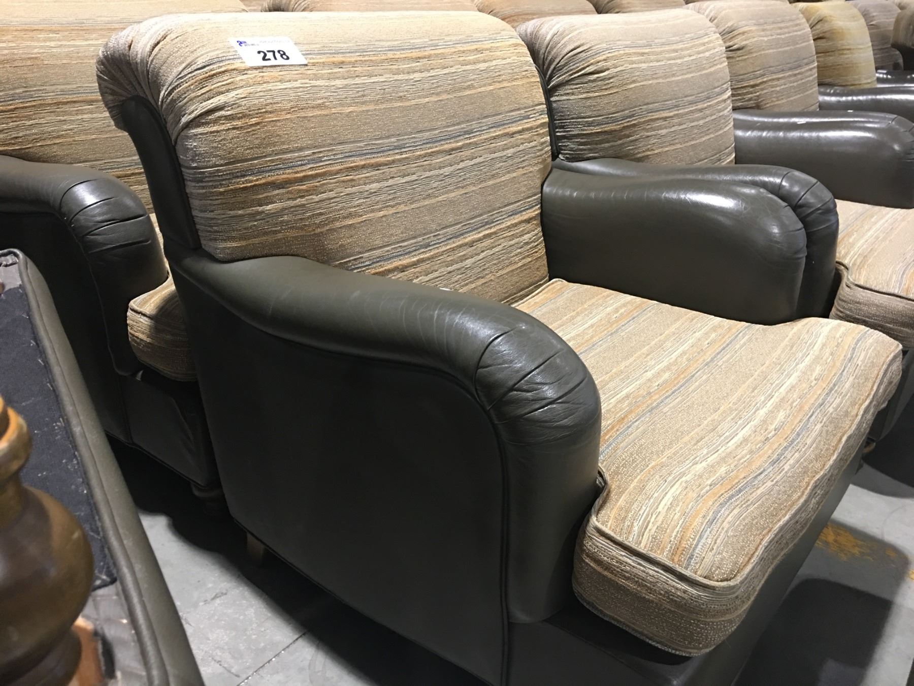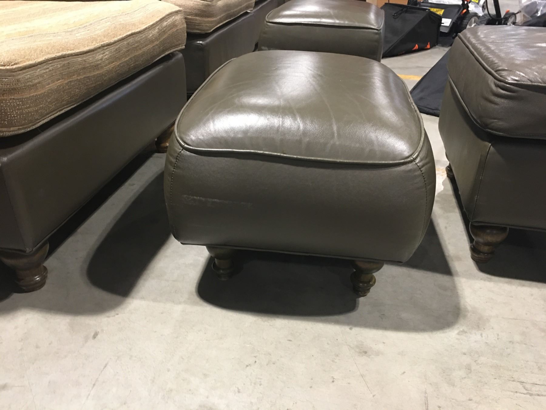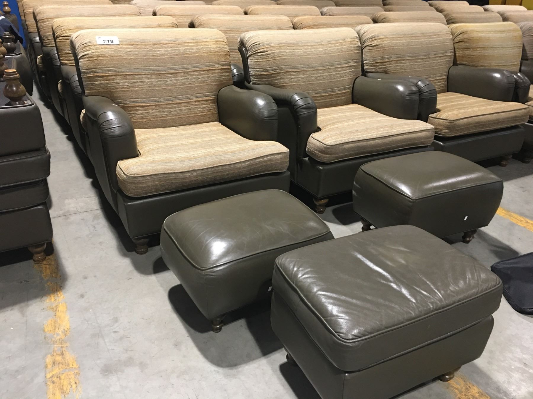 COMFY EASY CHAIR - NEUTRAL TONE WITH GOLD FLECKS WITH OTTOMAN. LEATHER AND FABRIC. THESE CHAIRS WERE MANUFACTURED BY SPINNYBACK NEW YORK USING MAPLE. HIGH QUALITY FABRIC AND LEATHER FOR THE WICKANISH INN - E