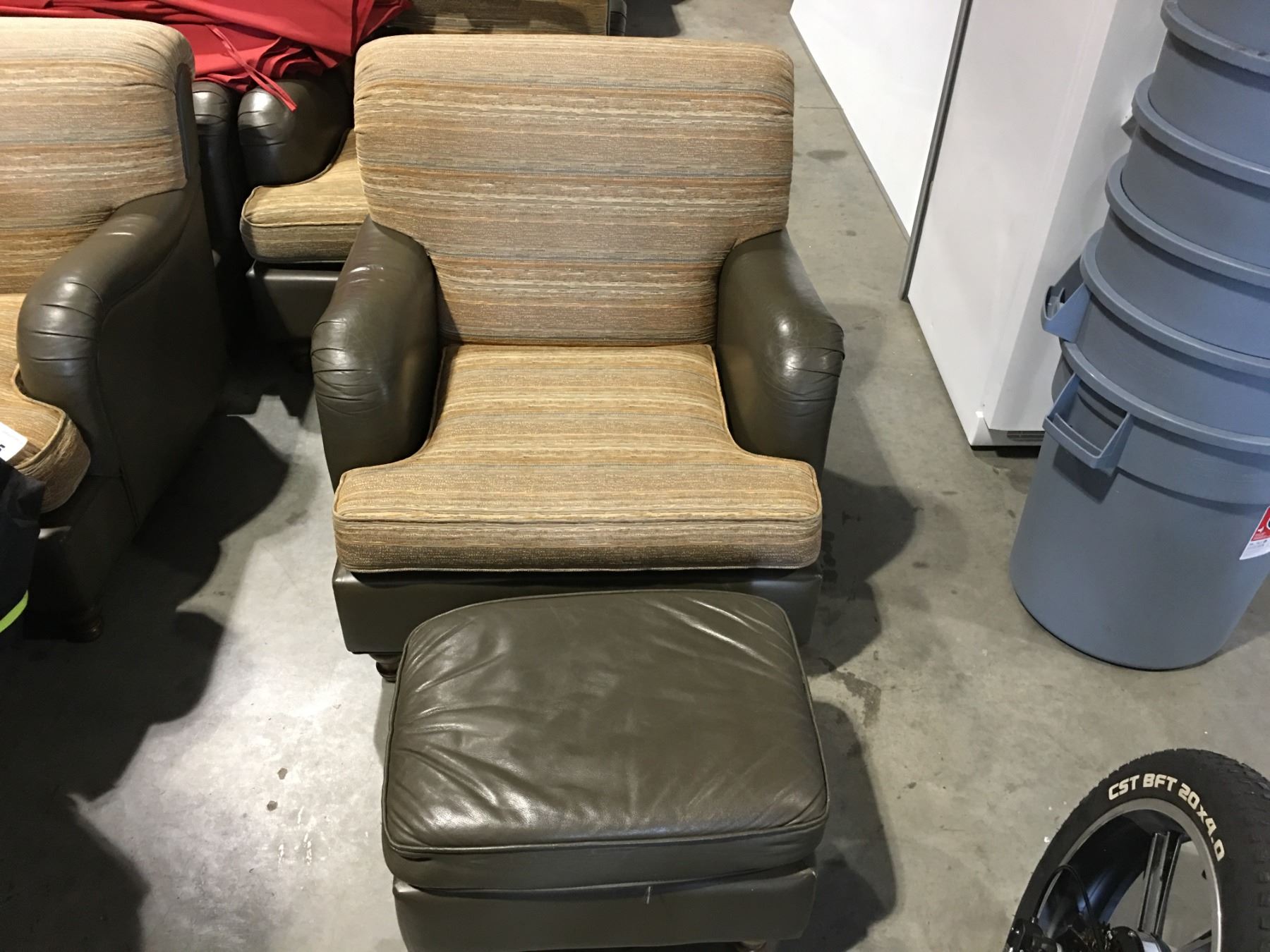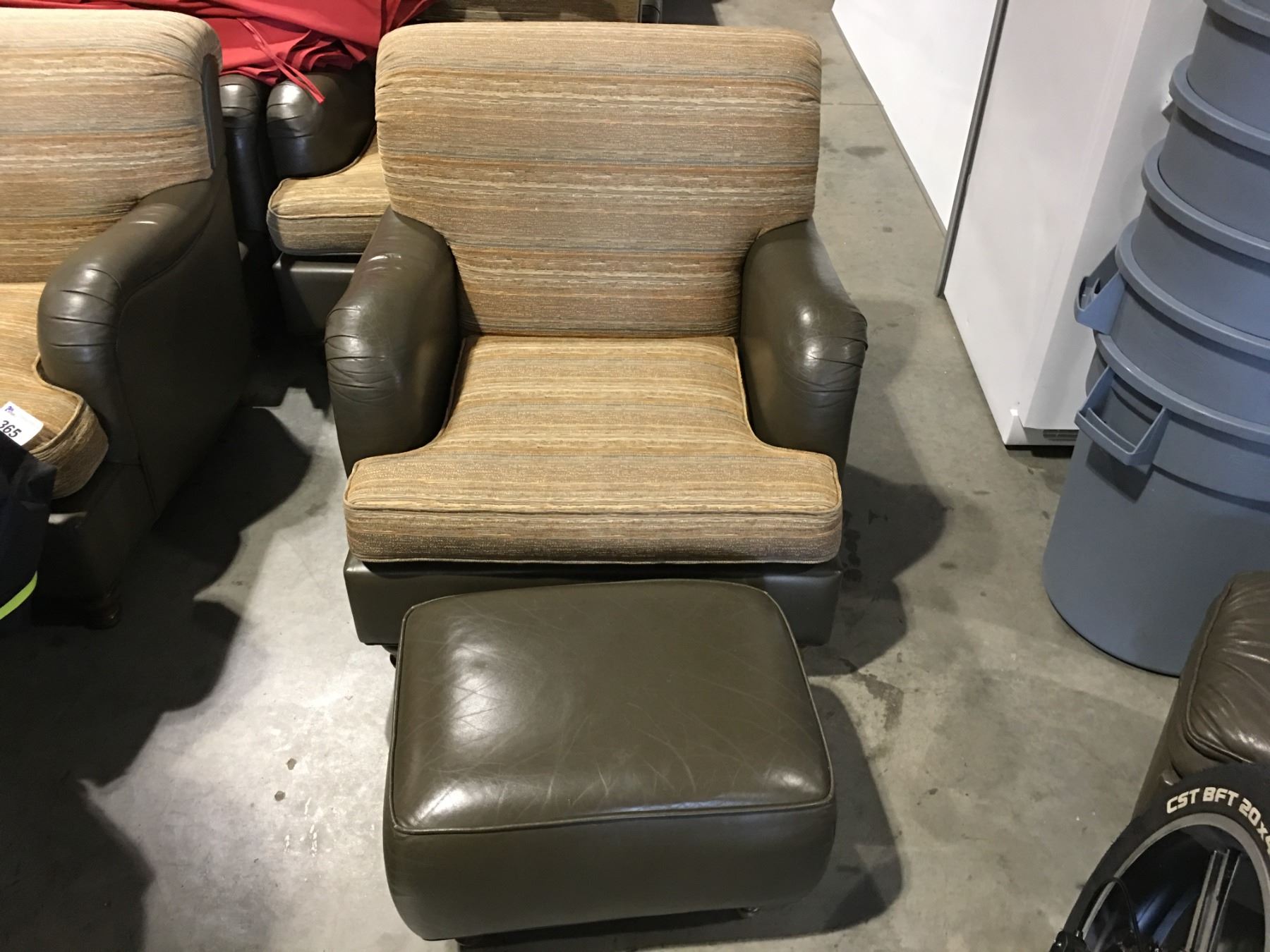 COMFY EASY CHAIR - NEUTRAL TONE WITH GOLD FLECKS WITH OTTOMAN. LEATHER AND FABRIC. THESE CHAIRS WERE MANUFACTURED BY SPINNYBACK NEW YORK USING MAPLE. HIGH QUALITY FABRIC & LEATHER FOR THE WICKANINNISH INN - H OTTOMAN STYLE WILL BE 1 OF 2 STYLES