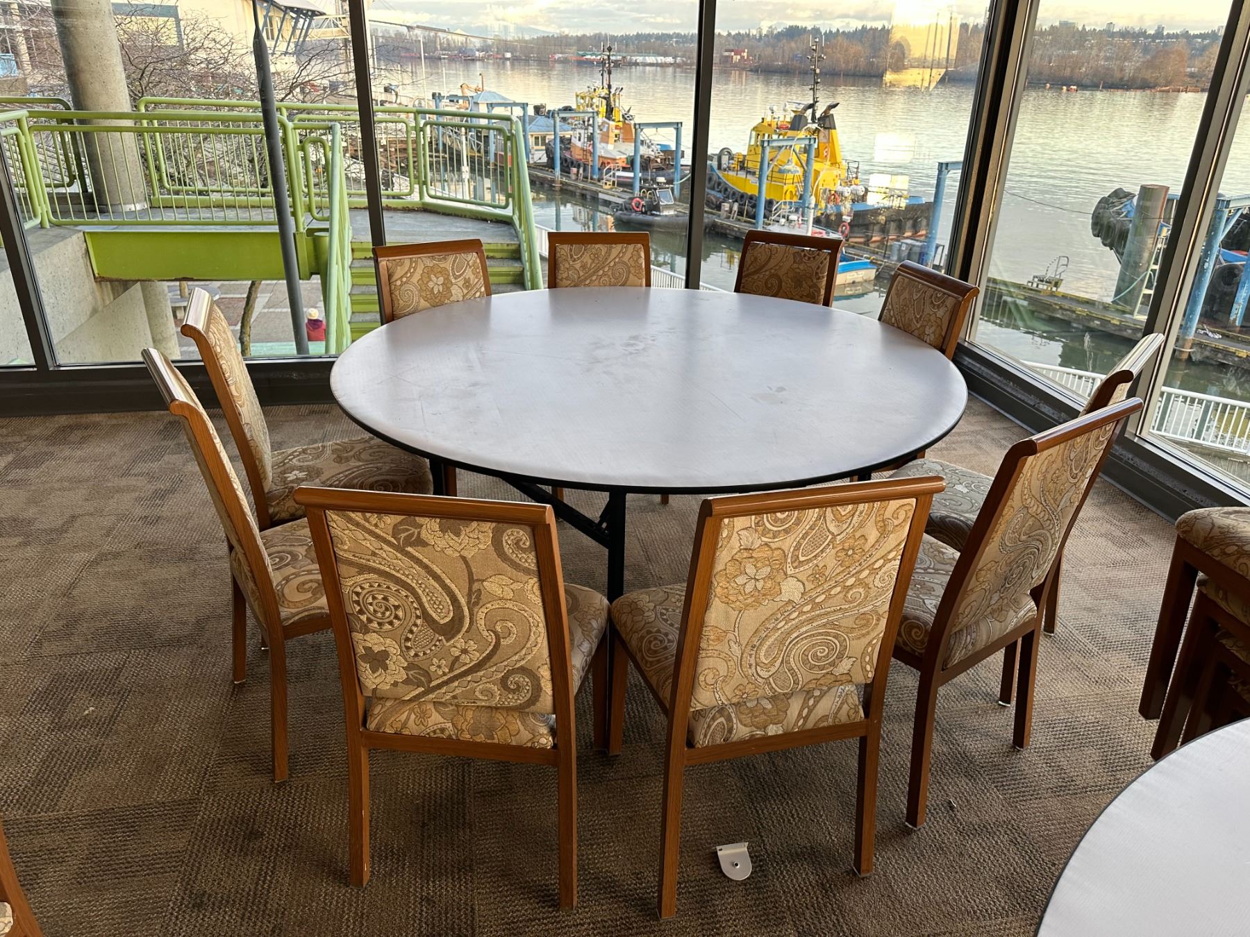 COMMERCIAL 6' ROUND COLLAPSIBLE DINING TABLE AND 10 LIGHT WOOD/FABRIC DINING CHAIRS