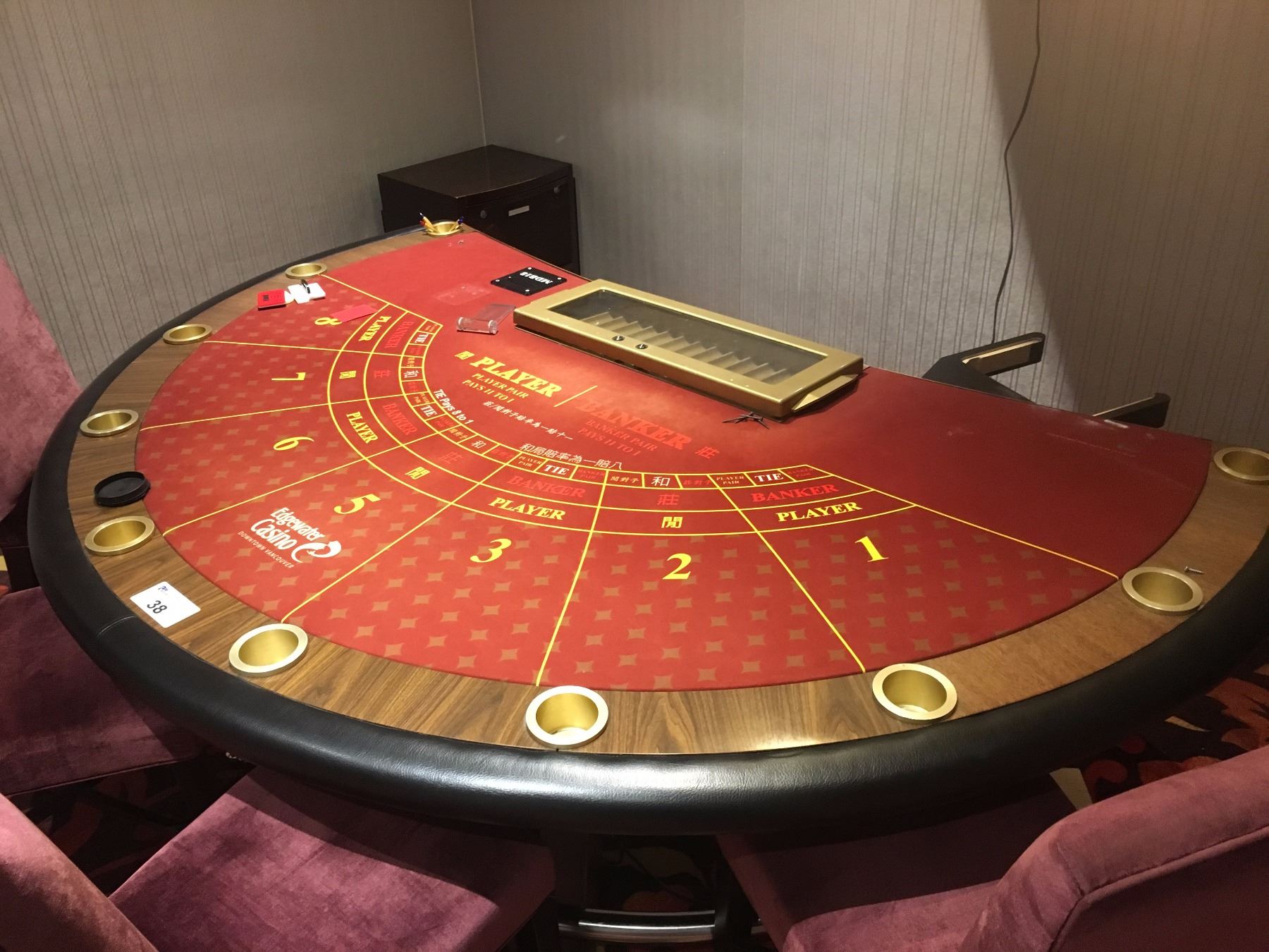 COMMERCIAL QUALITY 8 PLAYER BACCARAT TABLE WITH LOCKING CHIP TRAY AND DROP SAFE *FELT WILL BE REMOVED PRIOR TO SALE*