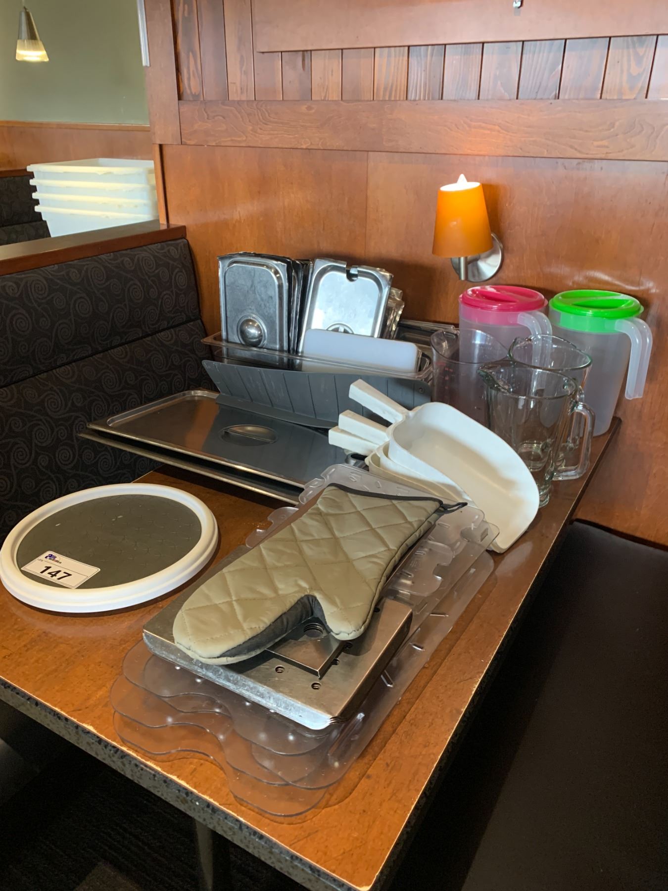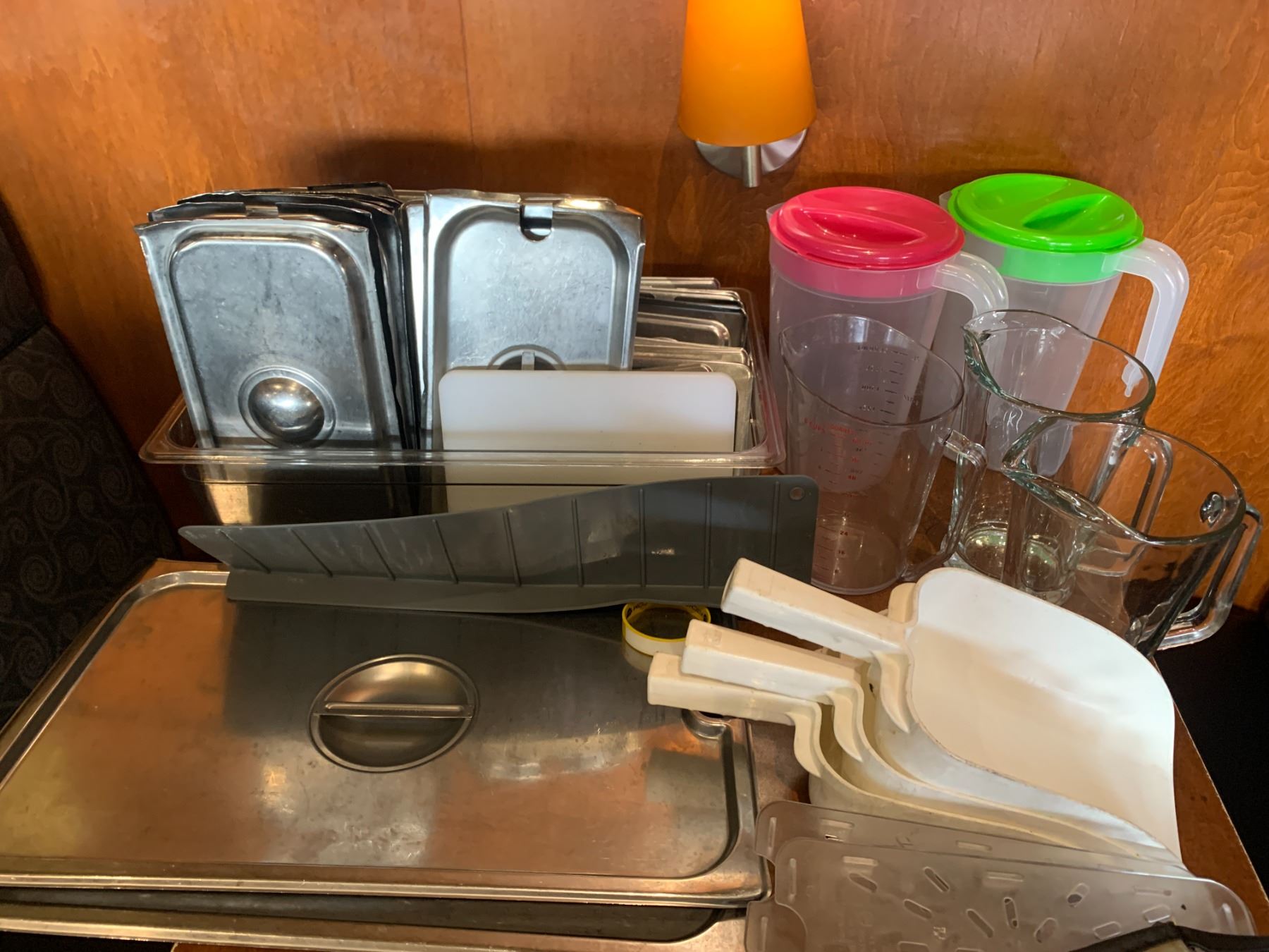 COMMERCIAL STAINLESS STEEL INSERT LIDS, DRIP TRAYS, A LAZY SUSAN, 5 DRINK PITCHERS & 3 ICE SCOOPS
