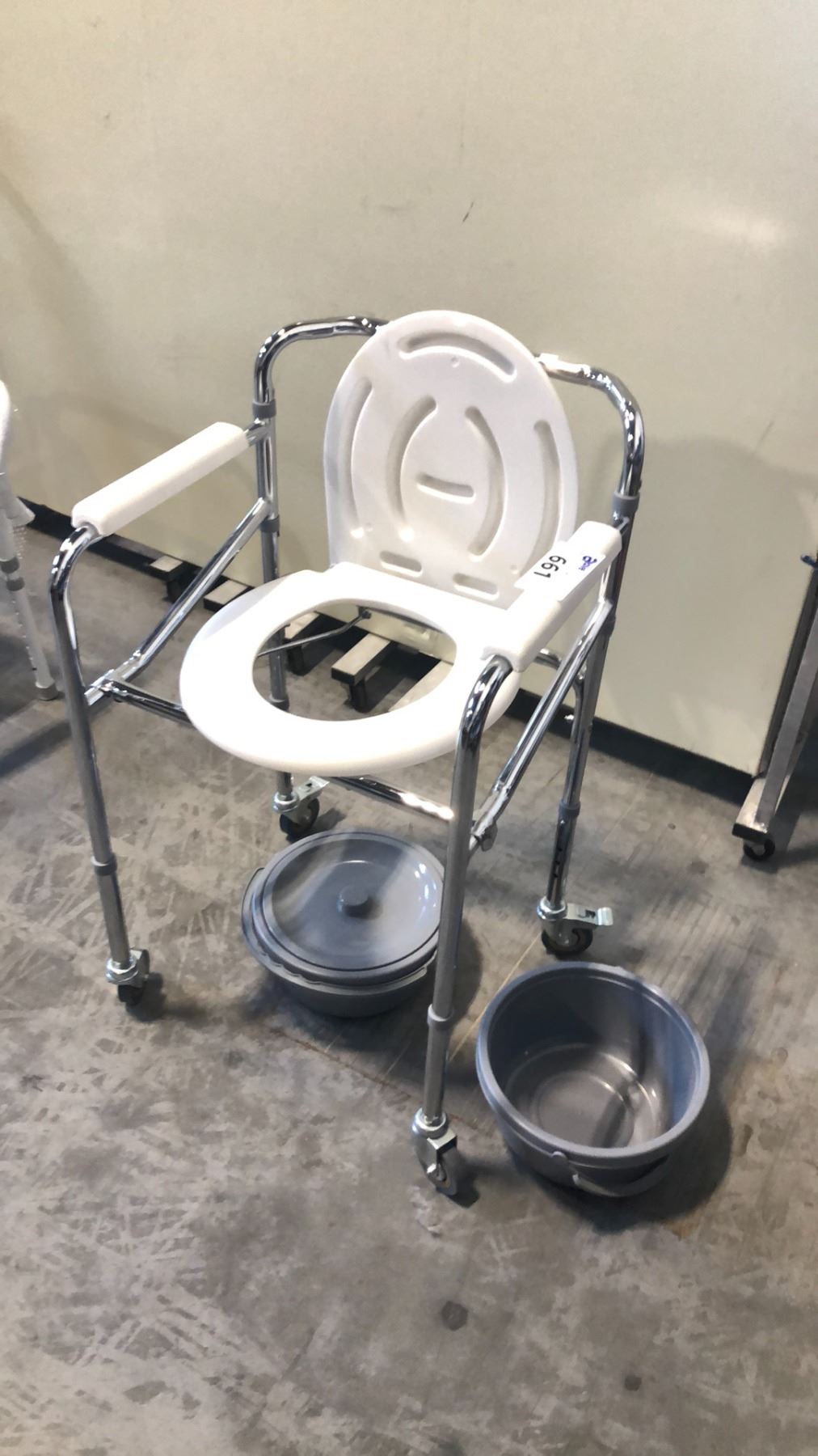 COMMODE CHAIR CHROME FINISH W/ WHEELS AND CONTAINER