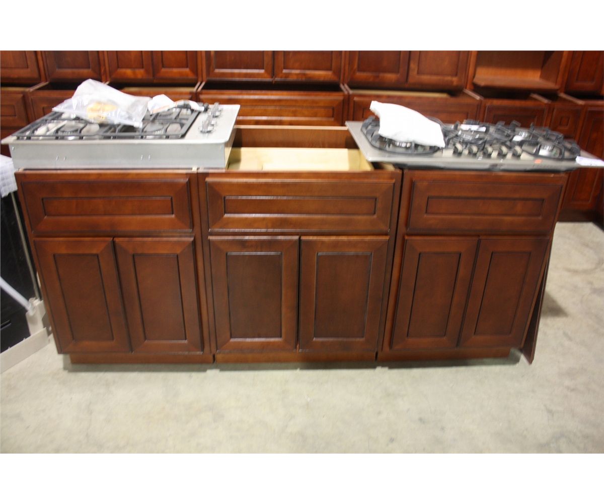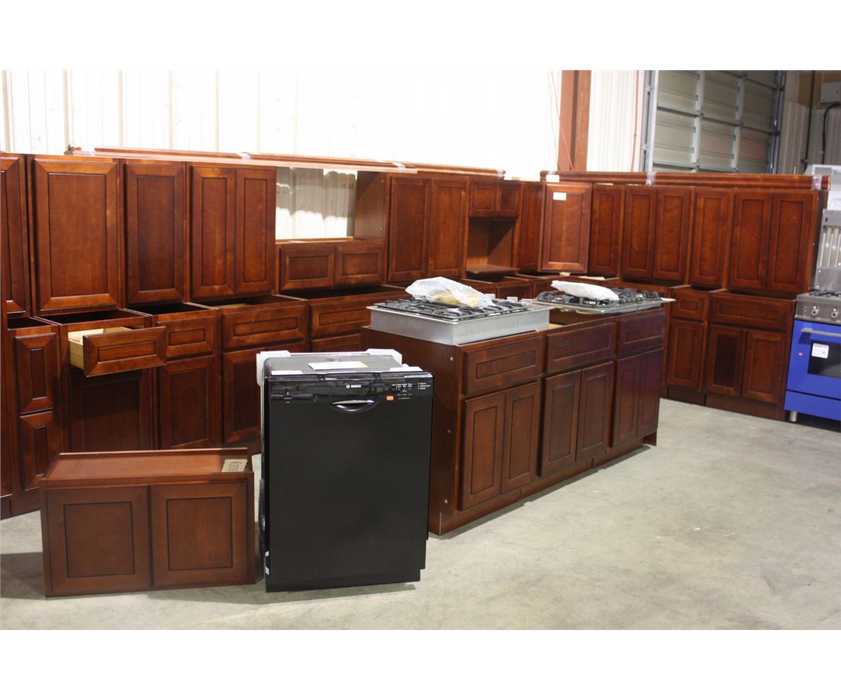 COMPLETE DARK CHERRY KITCHEN CABINET SET INC: 17 BASE CABINETS - 19 WALL CABINETS- AND LARGE QUANTITY OF TRIM, MOLDING AND SIDE PANELS