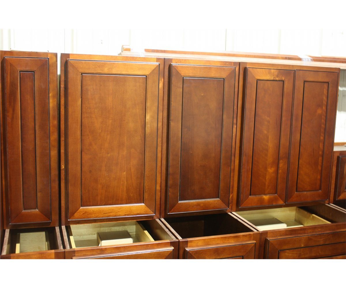 COMPLETE DARK CHERRY KITCHEN CABINET SET INC: 17 BASE CABINETS - 19 WALL CABINETS- AND LARGE QUANTITY OF TRIM, MOLDING AND SIDE PANELS