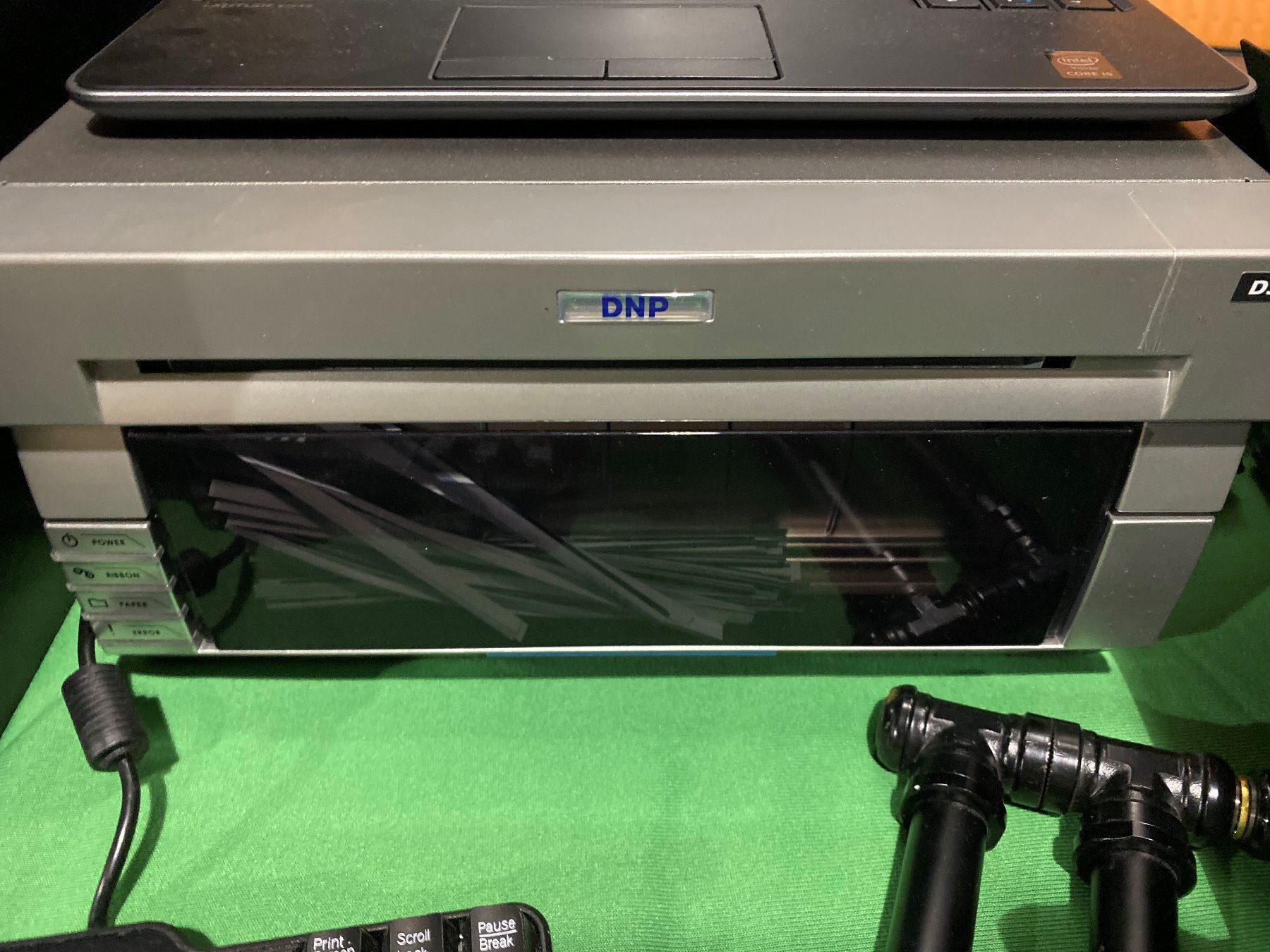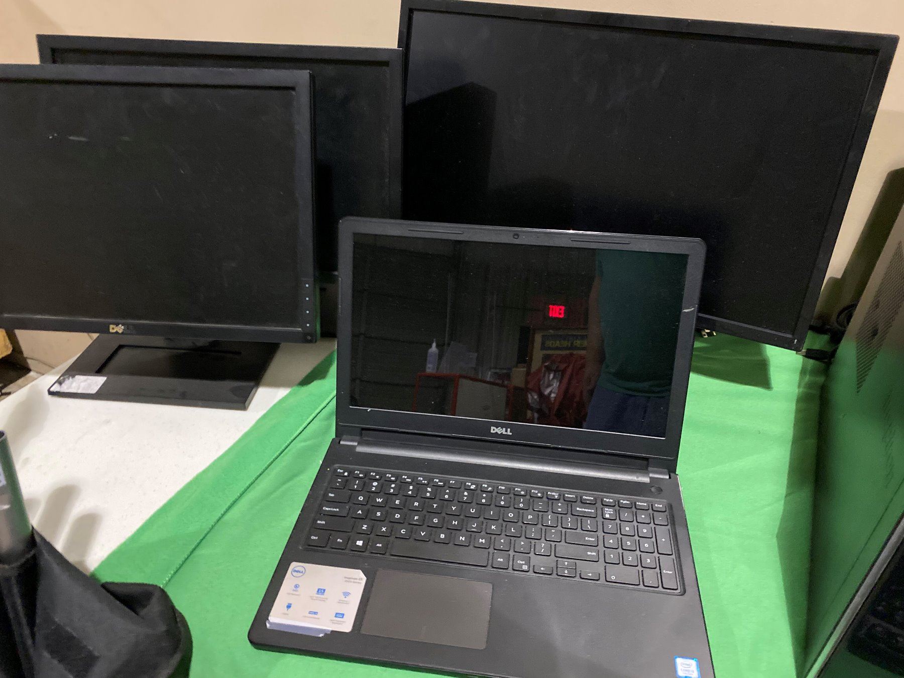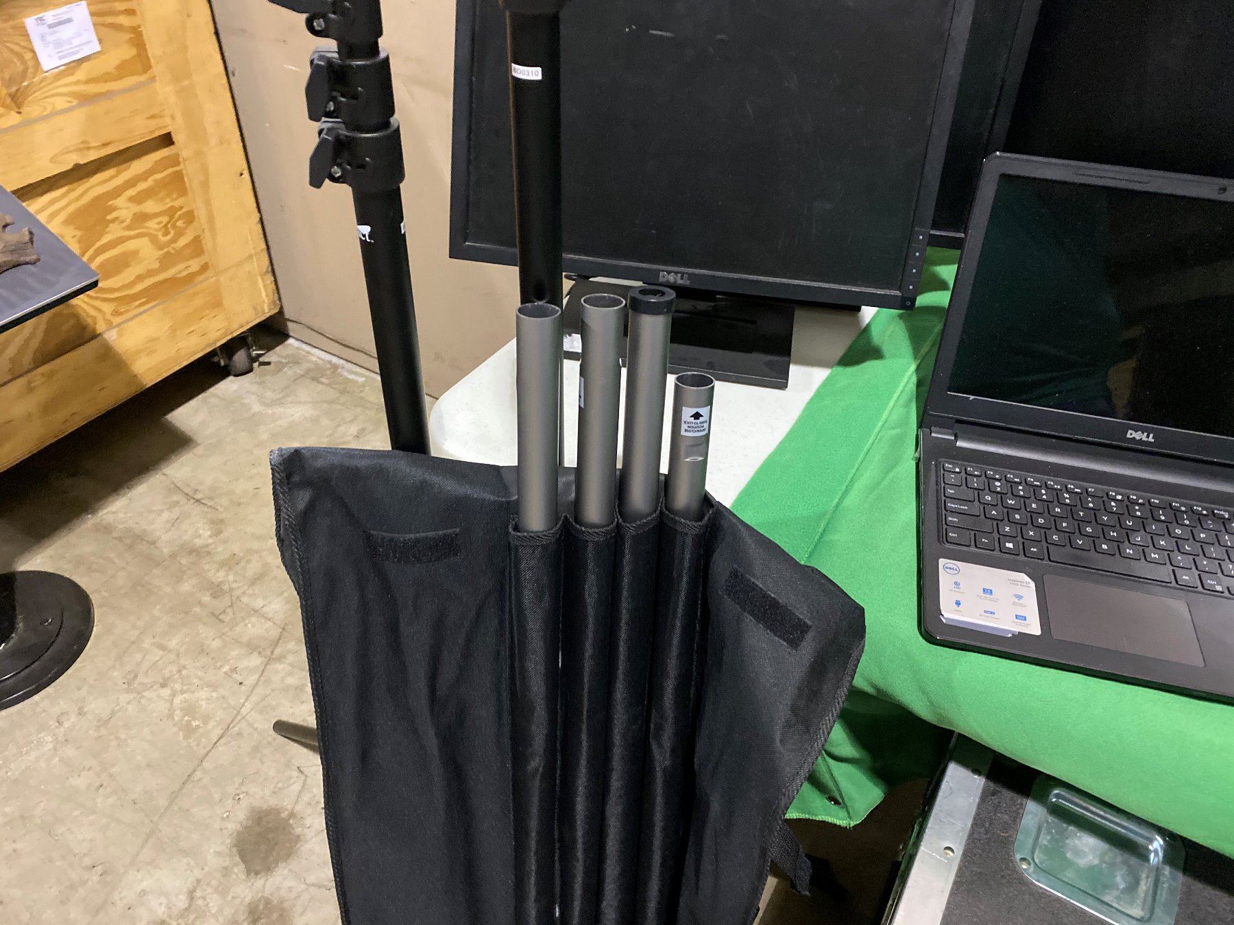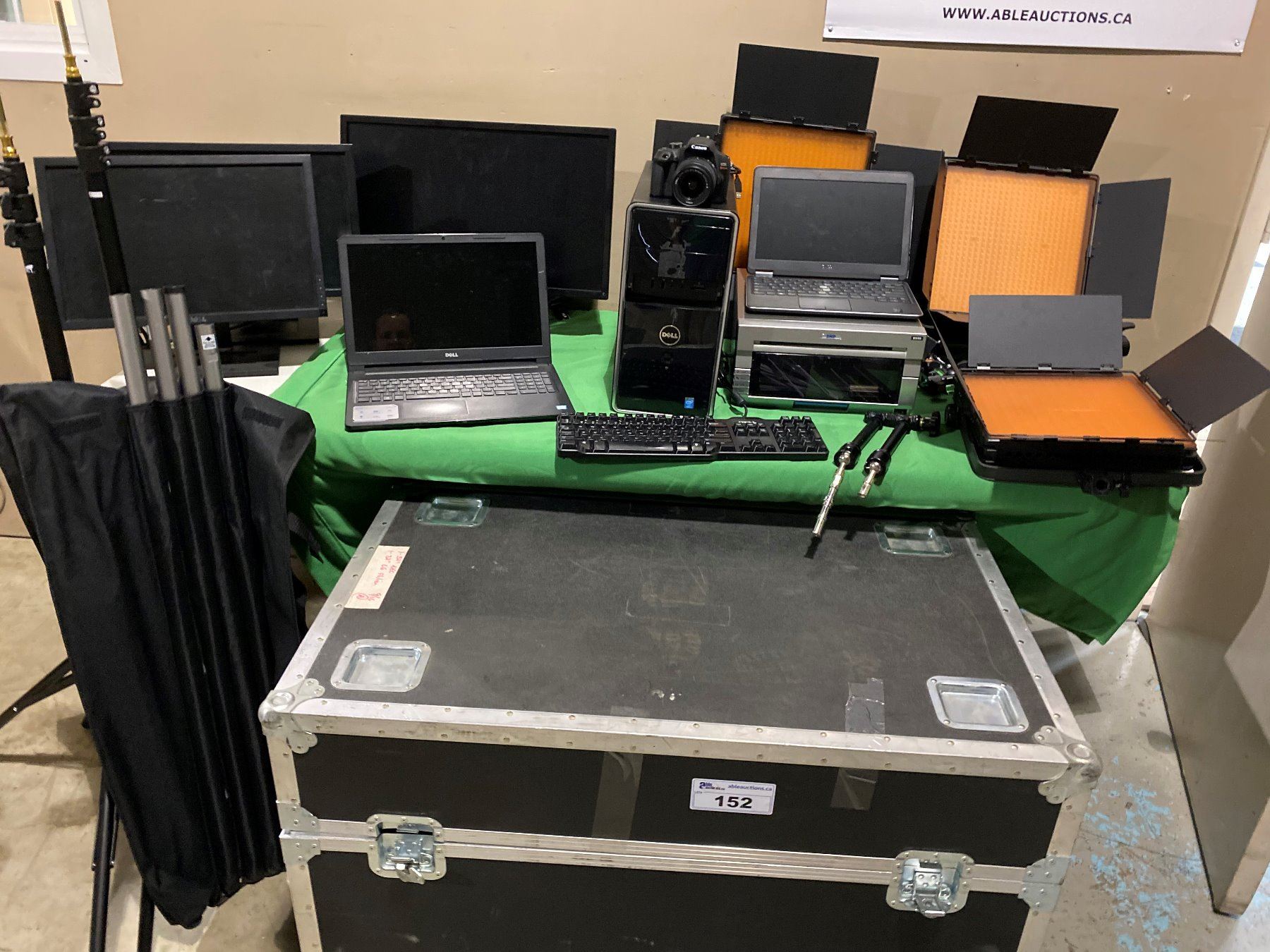COMPLETE GREEN SCREEN SYSTEM INC.: APPROX. 12' WIDE GREEN SCREEN WITH COLLAPSABLE STAND, CANON EOS REBEL T6 DIGITAL CAMERA, 2 DELL LAPTOP COMPUTERS (HDS WIPED), DELL COMPUTER (HD REMOVED), 4 DELL MONITORS, DNP DS COLOUR PHOTO PRINTER, 3 X STUDIO PRO FLASH / LIGHTING PANELS EACH WITH TETHER TOOLS MOUNTS COMES WITH ROAD CASE, ROAD CASE MEASURES: 39.5" WIDE X 24" DEEP X 25" TALL APPROX 350LBS