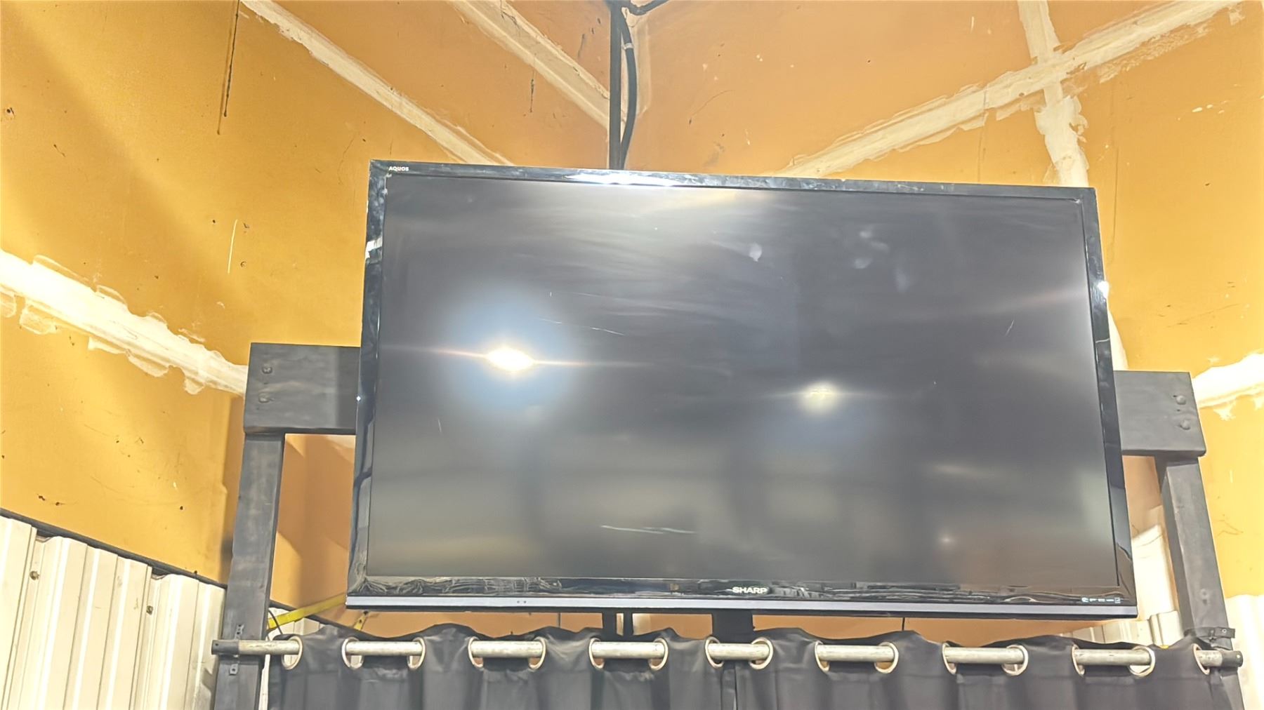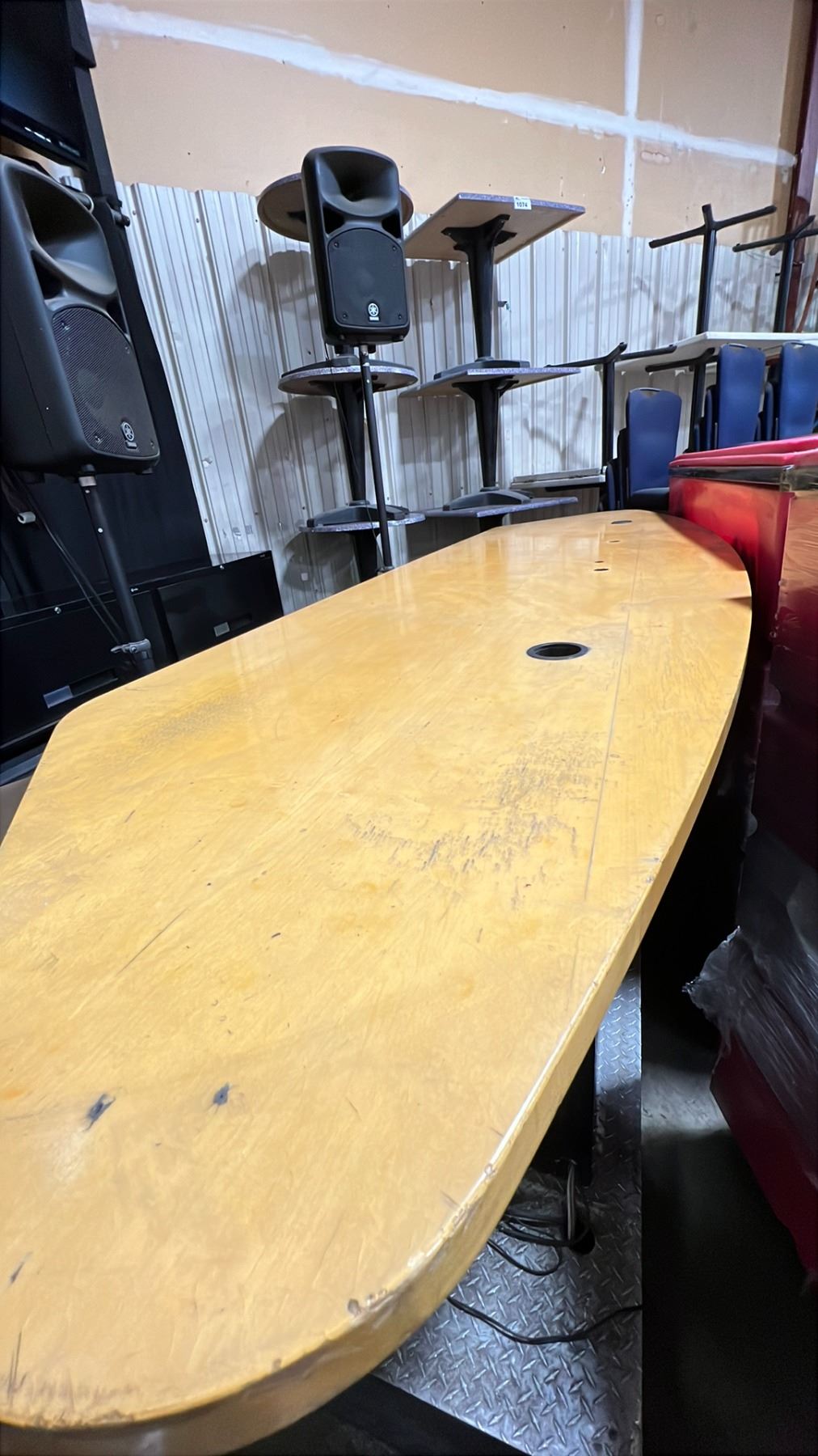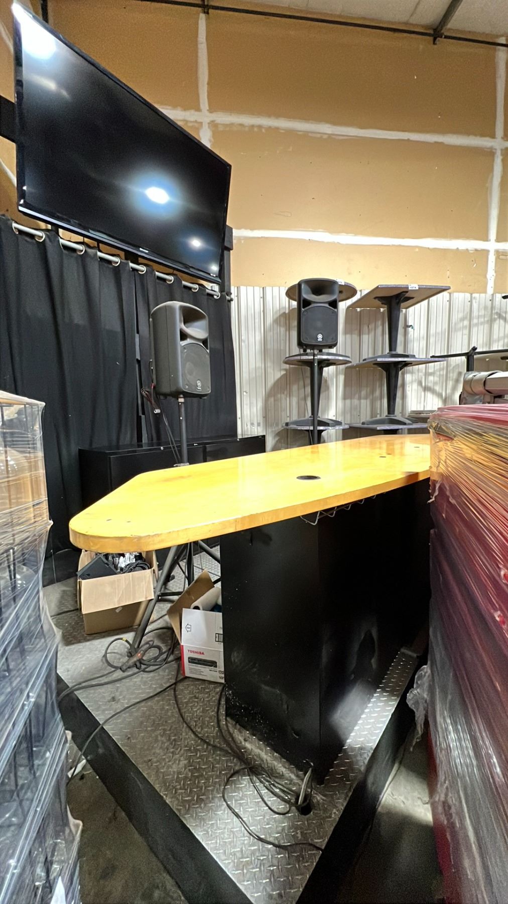 COMPLETE VISUAL EVENT PODIUM WITH SHARP 80" LCD TELEVISION WITH POWER CORD/REMOTE/WALL MOUNT, REAR CURTAIN, CHECKERED PLATE PLATFORM FLOOR, 4 BLACK METAL STORAGE CABINETS & BOW FRONT NATURAL MAPLE TOP *P.A & ELECTRICAL CONTENTS NOT INCLUDED/ MUST HAVE PROPER TECHNICIAN/ TOOLS TO DISMANTLE*