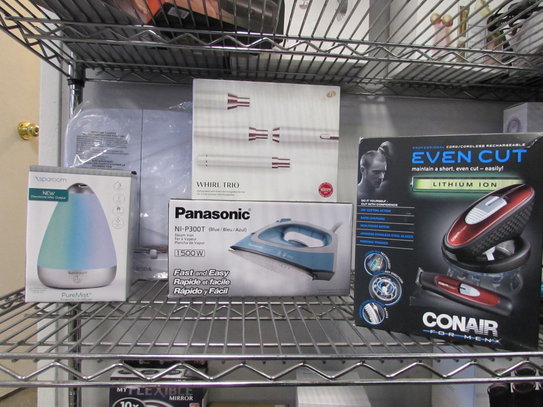 CONAIR EVEN CUT SHAVER, PANASONIC STEAM IRON, SPA ROOM PURE MIST DIFFUSER, JERDON MIRROR, WHIRL TRIO STYLING WAND
