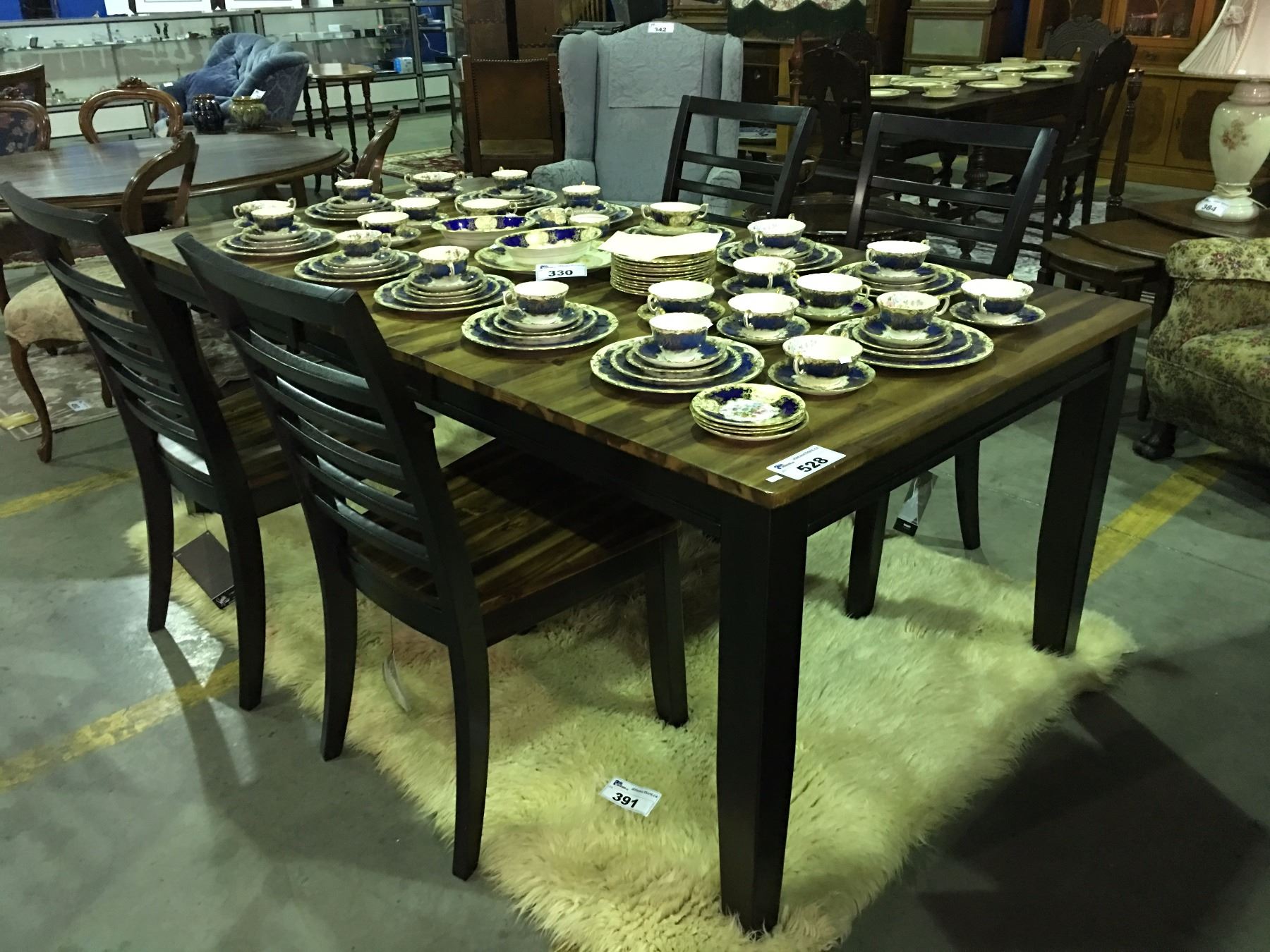 CONTEMPORARY TWO TONE BROWN ON BROWN DINING TABLE WITH JACK KNIFE LEAF & 4 LADDER BACK CHAIRS