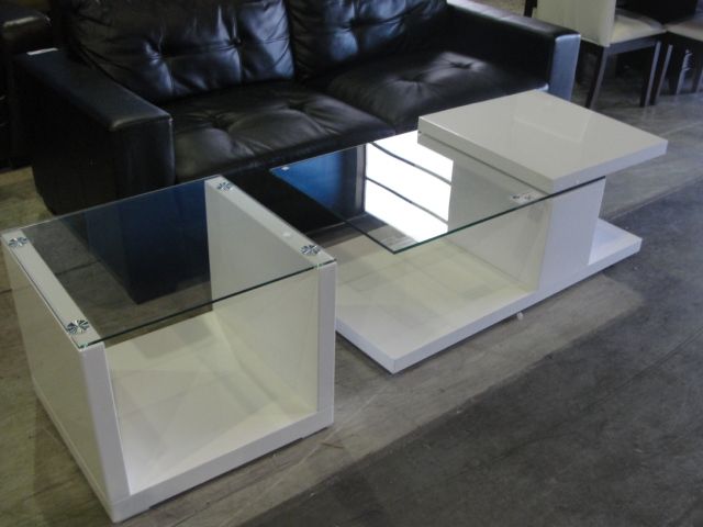 CONTEMPORARY WHITE LAQUER AND GLASS TOP 2PC COFFEE AND END TABLE SET